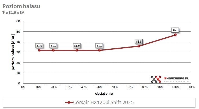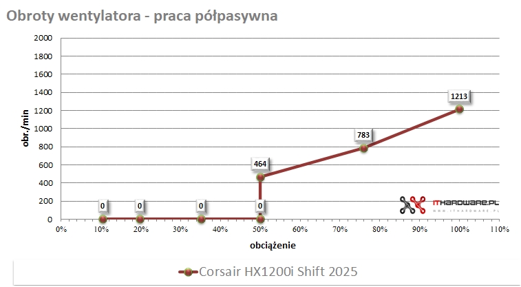 Zasilacz Corsair HX1200i Shift 2025 uruchamia wentylator po przekroczeniu około 50% obciążenia, co odpowiada mocy rzędu 550–650 W. Jednostka wspiera tryb ZeroRPM, w którym wentylator pozostaje całkowicie zatrzymany przy niskim i średnim obciążeniu, a dodatkowo parametry pracy wentylatora mogą być monitorowane i kontrolowane cyfrowo poprzez ekosystem iCUE LINK. Po przekroczeniu temperatury zadanej regulator płynnie zwiększa prędkość wentylatora do wartości wymaganych przez sekcję sterującą PSU, utrzymując stabilne temperatury bez gwałtownych zmian hałasu. W praktyce przy pełnym obciążeniu (T6) wentylator osiągał około 1213 obr./min, uzyskując 46,8 dBA.