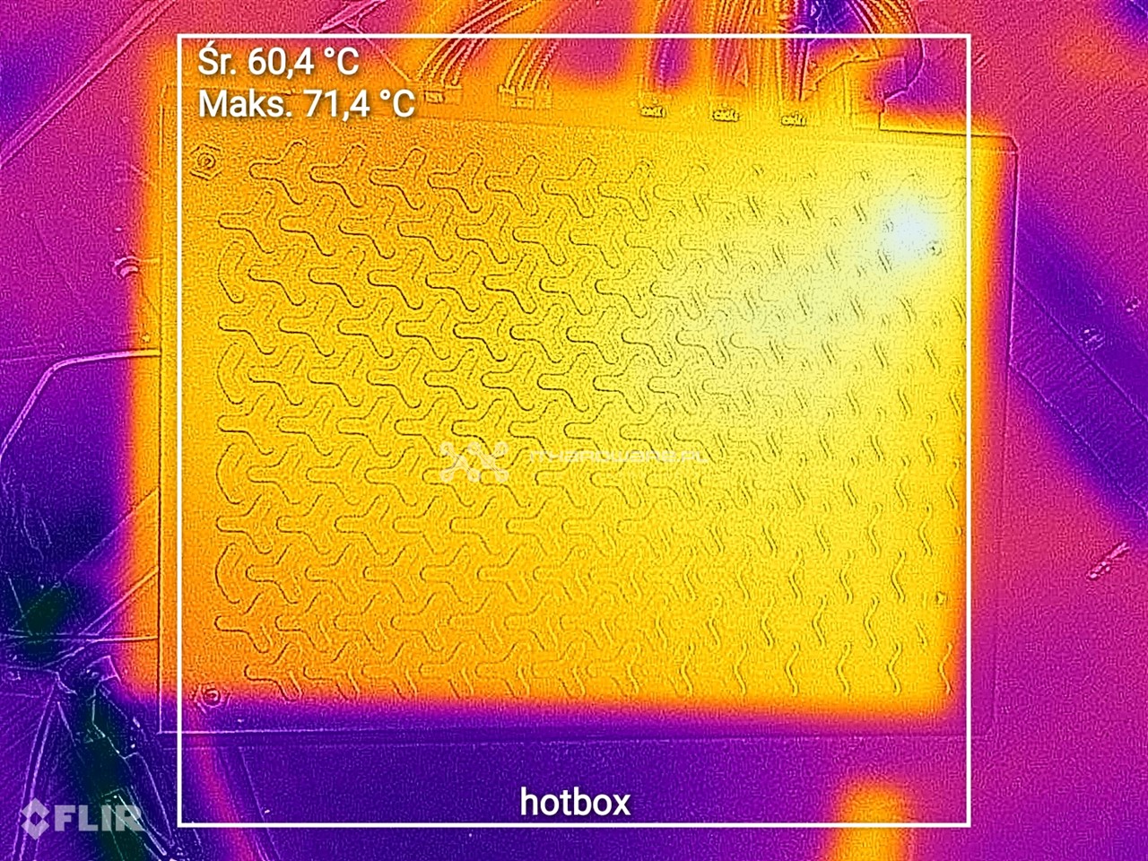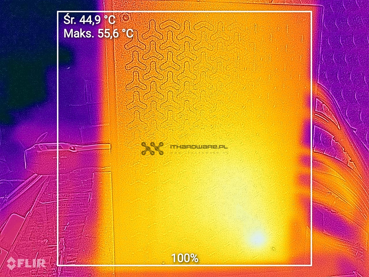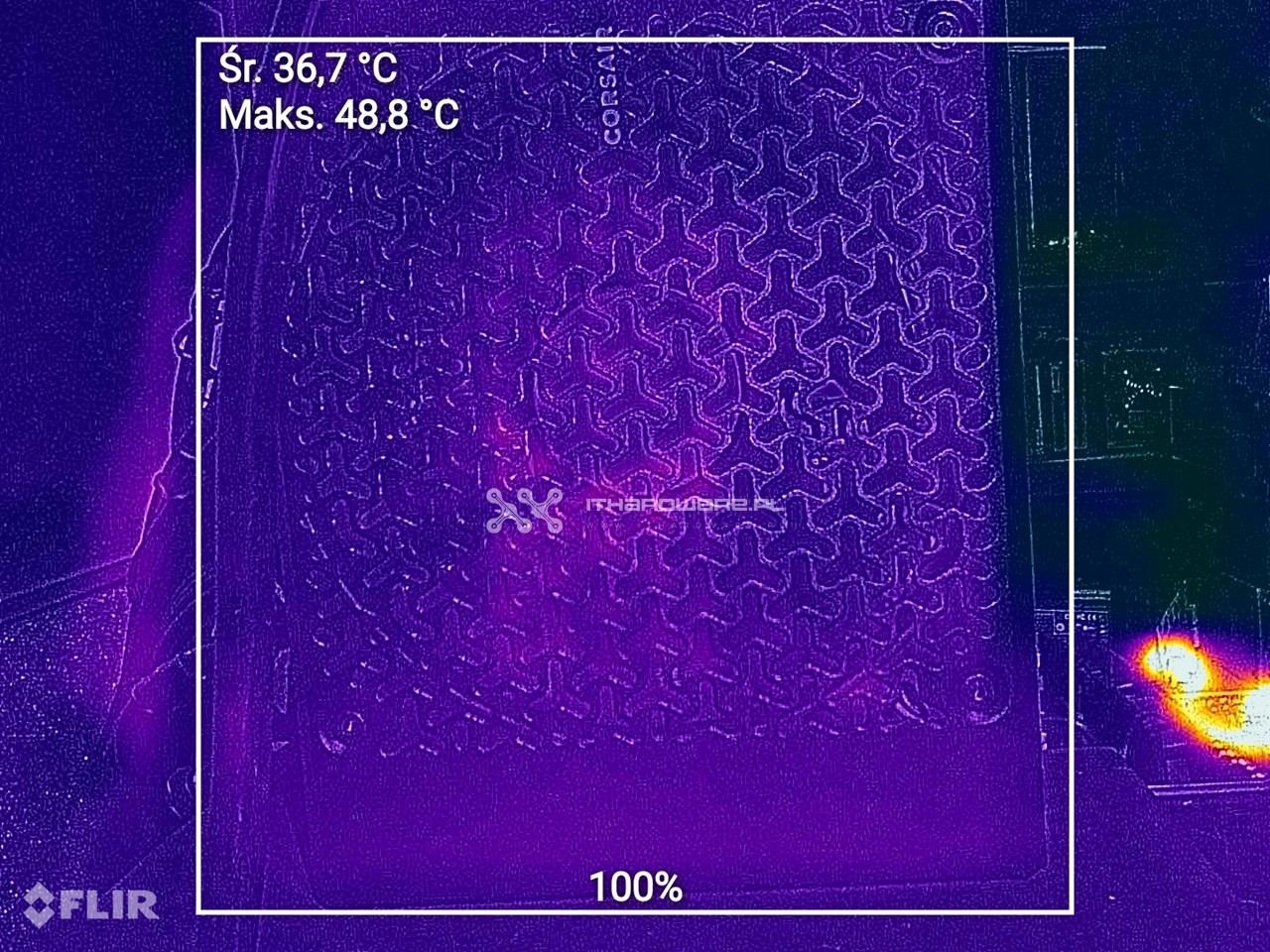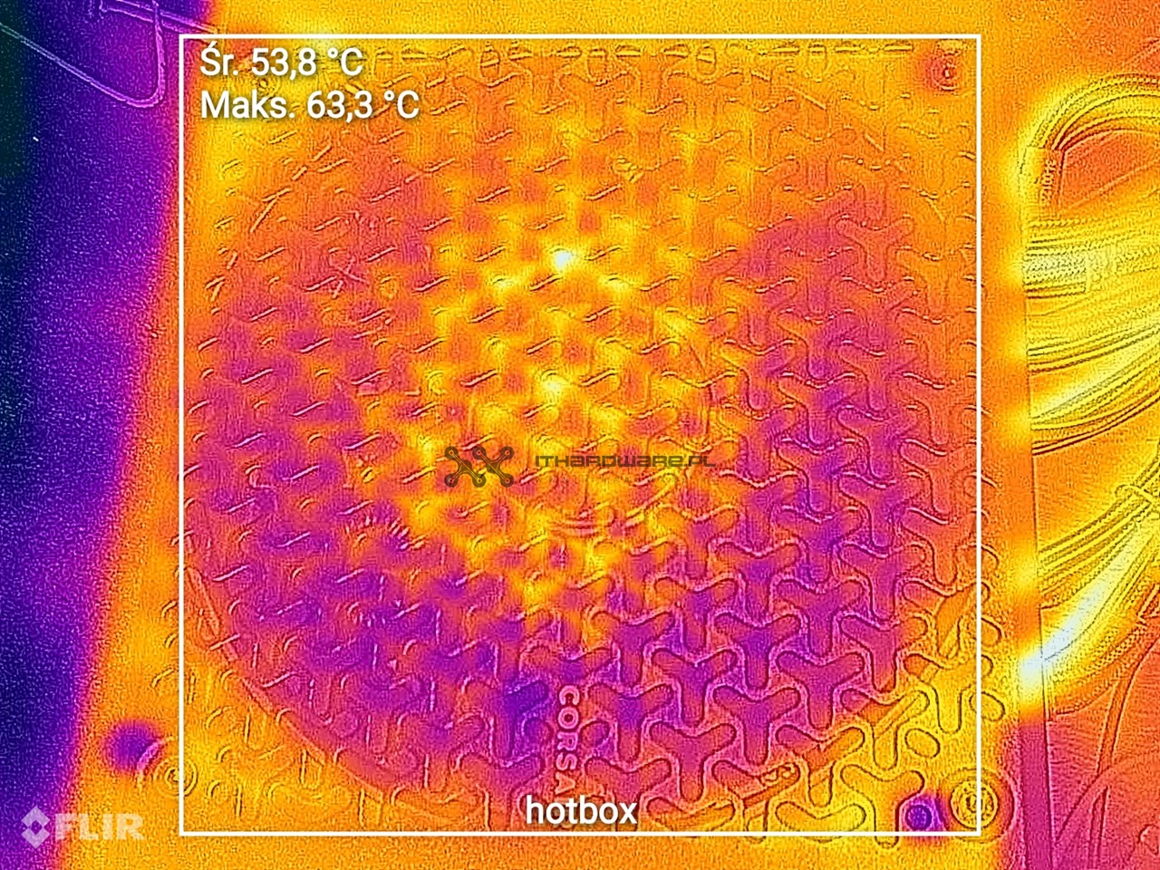 Pod pełnym obciążeniem maksymalna temperatura od strony wentylatora wyniosła 48,8°C, natomiast na obudowie 55,6°C. W warunkach hot box odnotowałem wyższe wartości – 63,3°C na stronie wentylatora i 71,4°C na spodzie obudowy.