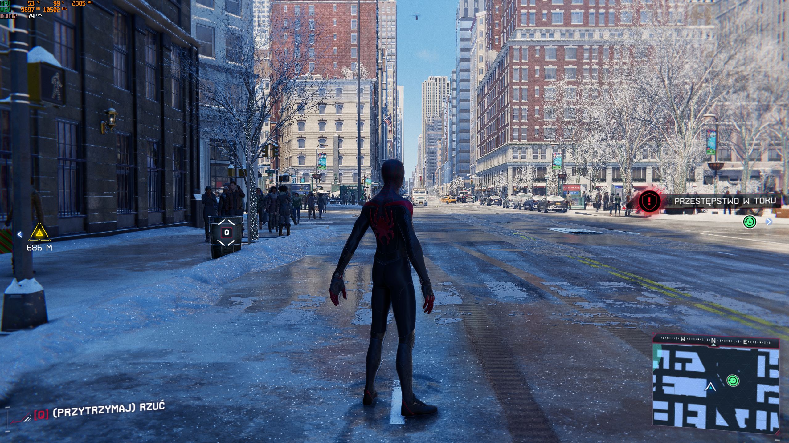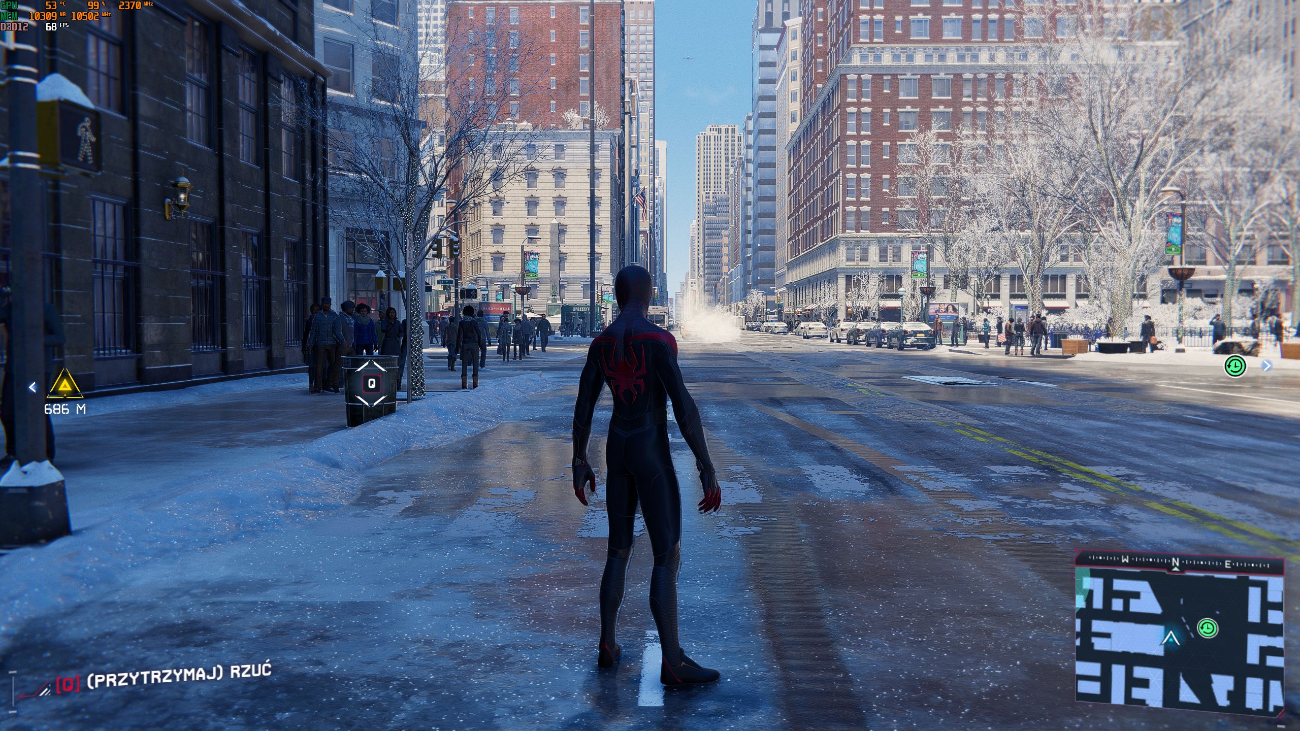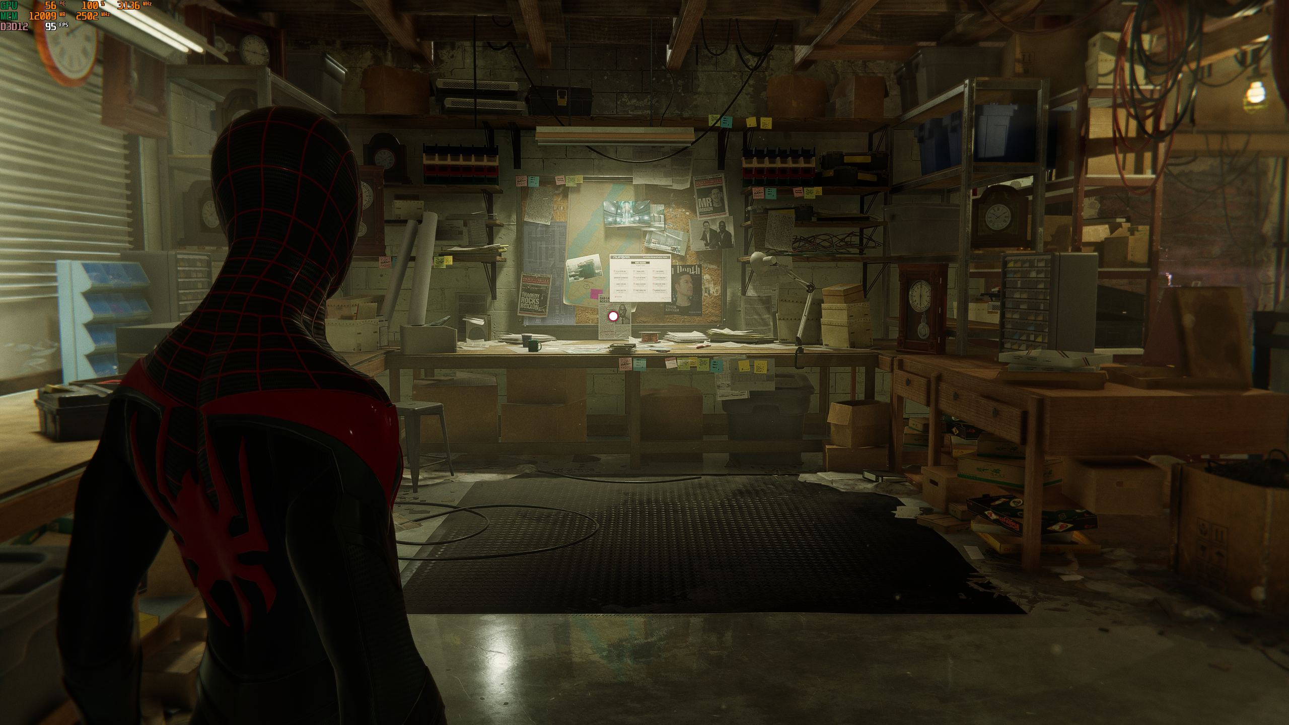 W Spider-Man w lokalizacji A warto zwrócić uwagę na budynki, gdzie w zależności od wybranego skalera, można dostrzec mniejsze lub większe migotanie oraz postrzępione krawędzie. Najsłabiej z tymi wyzwaniami radzą sobie DLSS 3 i FSR 4, choć wciąż przyzwoicie. Z kolei DLSS 4 wyraźnie zmniejsza widoczność tych artefaktów, a DLSS 4.5 eliminuje je praktycznie całkowicie. Odnośnie lokalizacji B, na początku nagrań, kiedy zaczyna się przerywnik filmowy, istotną rzeczą są pokryte śniegiem i lodem gałęzie drzew, które z FSR 4 dość wyraźnie migoczą. Z DLSS 3 jest to mniej widoczne, a DLSS 4 i DLSS 4.5 przynoszą dalszą poprawę, przy czym według mnie Transformer v2 jest nawet marginalnie lepszy od poprzednika. A, kiedy już bohater dostaje się do warsztatu, istotnymi elementami sceny jest elektronika na półkach oraz dokumenty na stole, widoczne później. Największą trudność sprawiają one FSR 4, a wszystkie warianty DLSS wypadają nieco lepiej, choć oba Transformery w mojej ocenie mają marginalną przewagę nad DLSS 3.