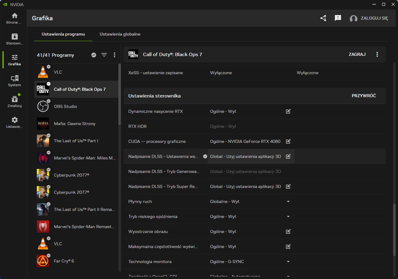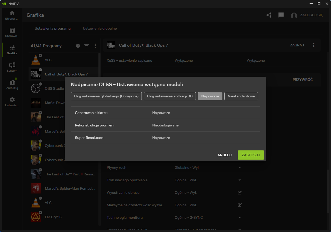 Testy wydajności zostały wykonane w dwóch grach - Call of Duty: Black Ops 7 oraz The Last of Us Part 2. Celem sprawdzenia, jak DLSS 4.5 działa na poszczególnych generacjach GPU, wybrałem następujące układy graficzne - GeForce RTX 2080 SUPER, RTX 3070, RTX 4060 Ti i RTX 5060. Dodatkowo, żeby nie zabrakło jakiegoś świeżego modelu z wyższej półki, na wykresach odnajdziecie też pomiary dla GeForce'a RTX 5080. Testy przeprowadziłem w rozdzielczościach Full HD, 1440p i 4K, przy maksymalnych ustawieniach graficznych, dla DLSS 3, DLSS 4 oraz DLSS 4.5 z modelem M, czyli takim, jaki włącza się po przestawieniu wspomnianej wcześniej opcji w NVIDIA App.