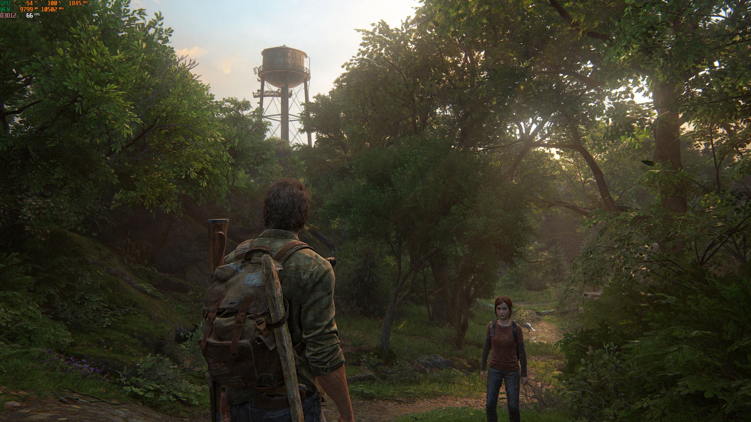 The Last of Us Part 1 dostarcza więcej ważnych informacji. W miejscu A dość słabo spisuje się DLSS 3, najgorzej radząc sobie z kratkami ogrodzenia po prawej, a dodatkowo cierpi na shimmering, widoczny na budynku w oddali po lewej, gdy Joel dociera nad wodę. Wtedy ujawnia się kolejny słaby punkt tego skalera, tzn. migotanie rzeźby, a później niestabilność kolumn oraz barierki na piętrze budynku. DLSS 4 poprawia wszystkie te aspekty, a DLSS 4.5 jest jeszcze lepszy, ale wciąż nie idealny, gdyż wspomniana rzeźba wciąż sprawia mu trudności. Co ciekawe, FSR 4 nie ma tego problemu, choć nieco gorzej radzi sobie z elementami na piętrze budynku pod koniec ujęcia, zatem całościowo między techniką od AMD a DLSS 4 oraz DLSS 4.5 jest z grubsza remis, z minimalnym wskazaniem na Transformer v2. Za to w miejscu B widać wyraźne smużenie przewodów sieci energetycznej z DLSS 3, co w dużej mierze eliminują DLSS 4 oraz FSR 4, przy czym to ostatnie rozwiązanie cierpi na ich migotanie w słońcu. DLSS 4.5 przynosi dalszą poprawę, całkowicie rozwiązując problem ze smużeniem.