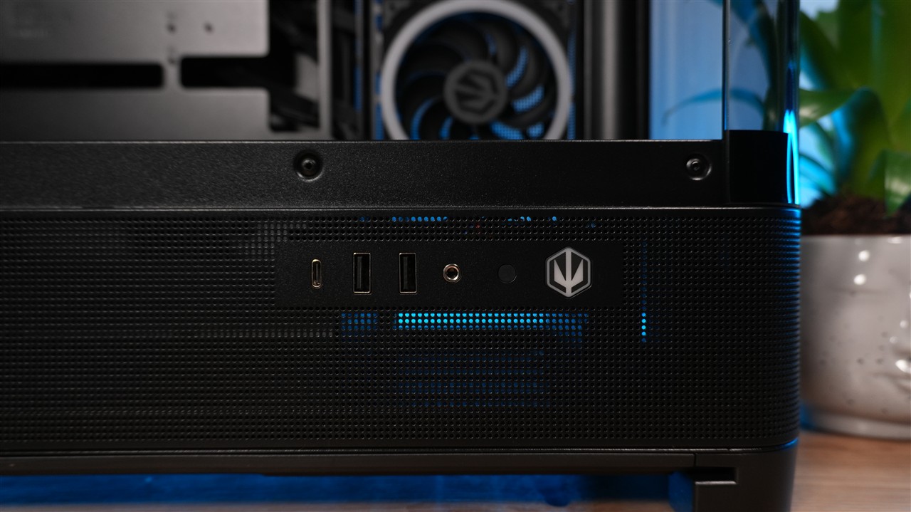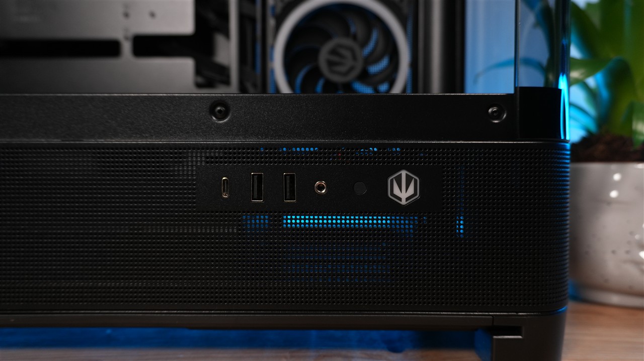 Sekcja z przyciskami i złączami została umieszczona na dole, tuż pod bocznym panelem ze szkła. Znajdziemy tam w pełni poprawny jak na aktualne czasy pakiet, któremu raczej niczego szczególnego nie brakuje. Mamy dwa USB 3.0, jedno USB 3.2 Gen 2 typu C i pojedyncze złącze audio (combo jack). Do tego dochodzą jeszcze dwa przyciski: Power (będący jednocześnie logo marki) oraz LED/Reset. Można jedynie narzekać na brak osobnych złączy audio dla słuchawek i mikrofonu, choć nie jest to jakiś duży problem.