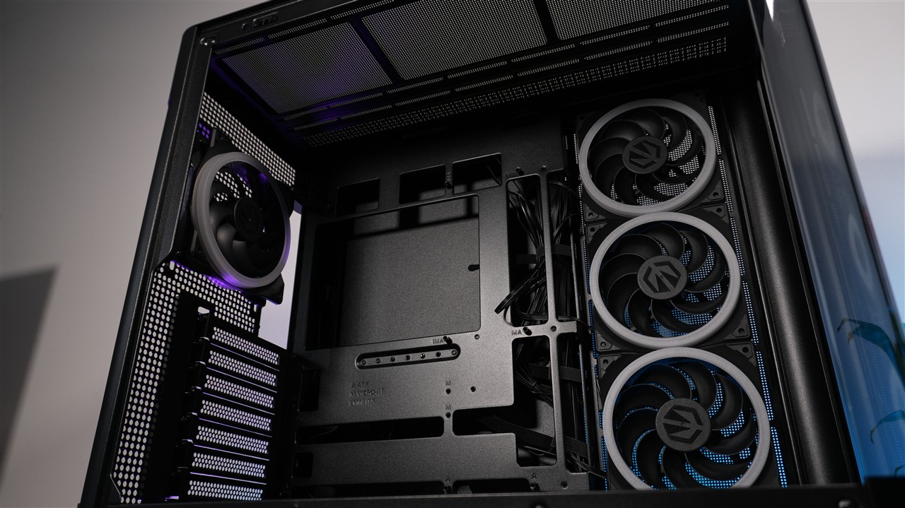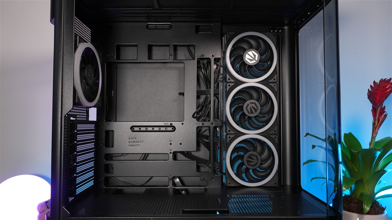 W głównej komorze mamy potężną ilość miejsca. Jest to głównie podyktowane obecnością trzech wentylatorów na ściance bocznej. Niemniej znacząco ułatwia to składanie komputera oraz jakiekolwiek przyszłe prace, jak chociażby upgrade. Ilość przepustów na okablowanie jest tutaj w pełni wystarczające. Same otwory są duże i zostały umieszczone w odpowiednich miejscach. Znalazł się nawet dedykowany otwór dla kabla zasilającego kartę graficzną. Co do zaślepek slotów rozszerzeń, są one wentylowane oraz wykręcane.