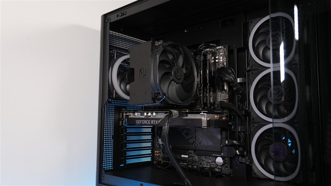 Wydajność systemu wentylacji jest testowana na dwa sposoby. Po pierwsze z wentylatorami obudowy ustawionymi na prędkość ok. 1000 RPM. Drugi test odbywa się z wentylatorami obudowy pracującymi na swoich najwyższych obrotach. W obu przypadkach prędkość wentylatora CPU to ok. 1064 RPM, a wentylatory karty graficznej osiągają ok. 2020 RPM. Temperatury na wykresach to wyniki delta, czyli odczyty z oprogramowania pomniejszone o aktualną temperaturę otoczenia.