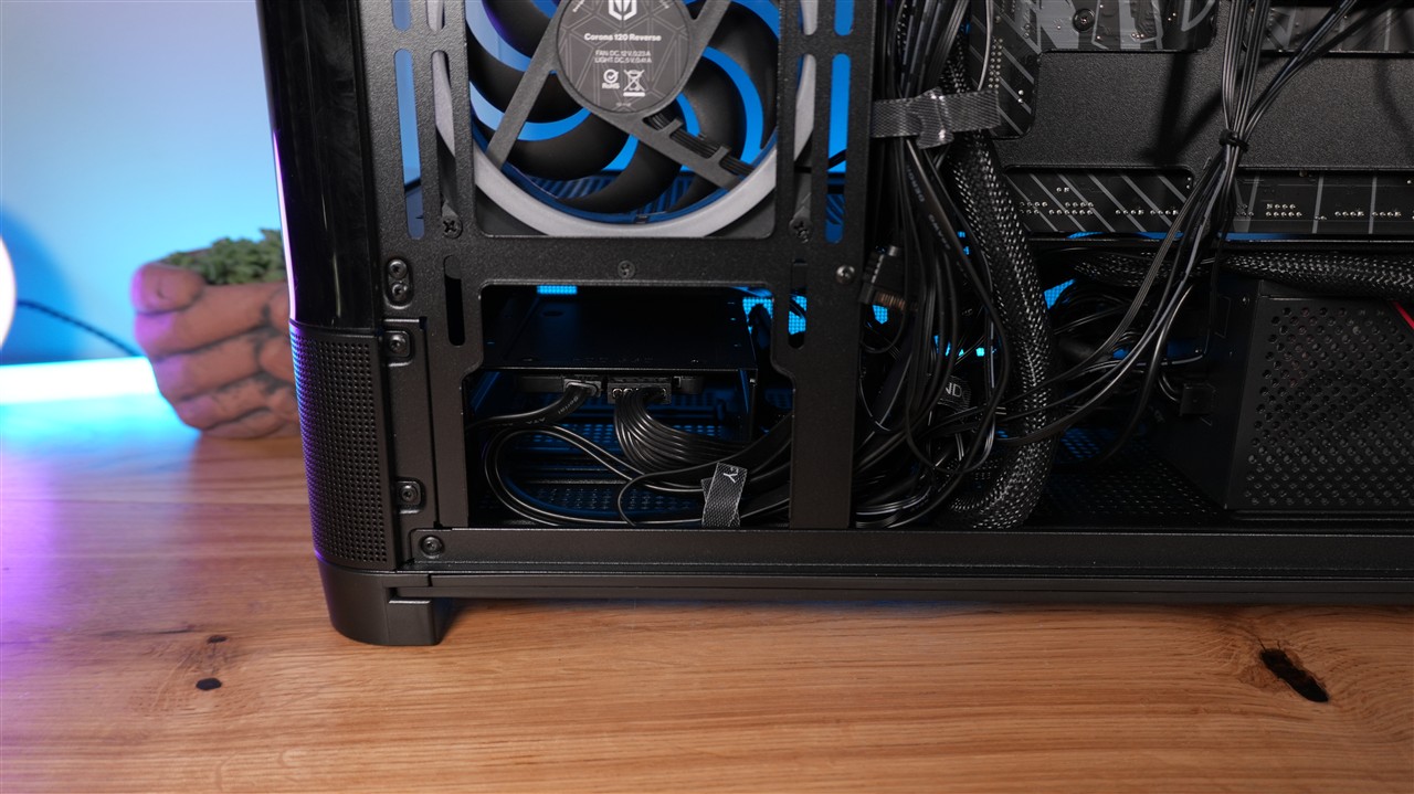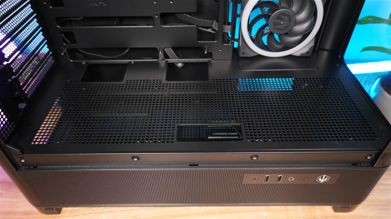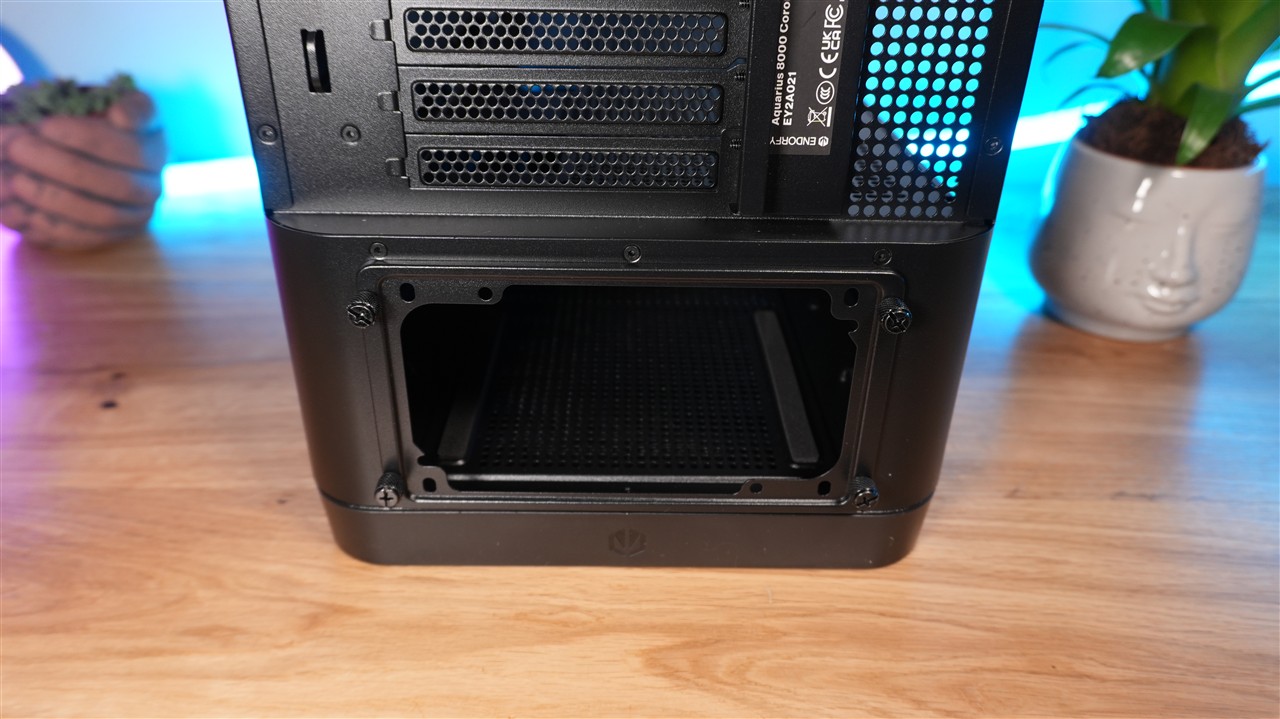 Dolna komora, w której kryje się zasilacz jest mocno perforowana, a więc powietrze ma swobodny przepływ między górą a dołem obudowy. Dobrze, że producent przewidział opcję montażu wentylatorów w tym miejscu, bo może to korzystnie wpłynąć na temperatury karty graficznej. Martwi mnie tylko, że Endorfy poszło śladem wielu innych producentów obudów typu fishtank i umieściło wentylatory na wprost szkła hartowanego. W praktyce zatem wieją one nie na podzespoły, a na szybę. Zobaczymy jak wpłynie to na temperatury, choć doświadczenie podpowiada, że może być słabo.