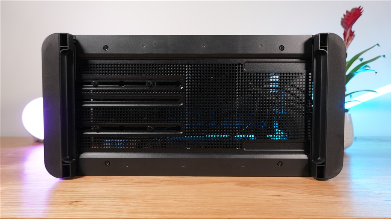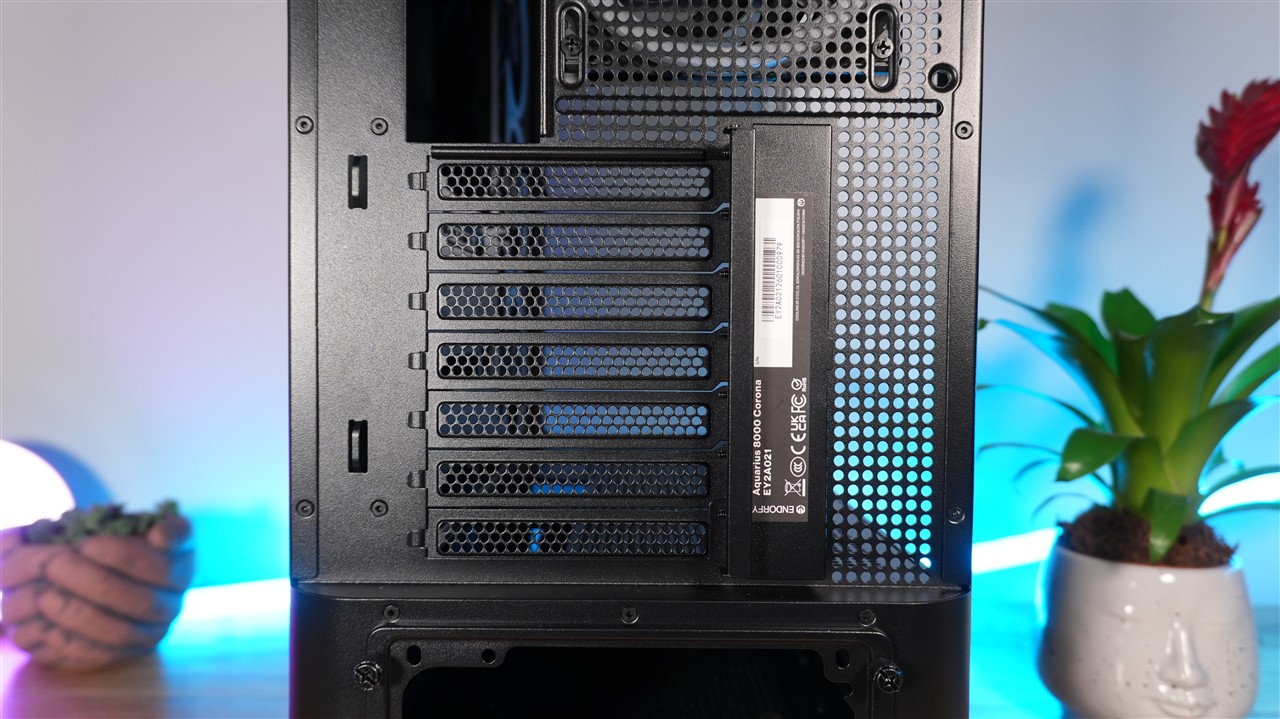 Z tyłu Aquariusa 8000 Corona dzieje się zaskakująco dużo. Zacznijmy od tego, że znaczna część blachy jest w tym miejscu perforowana. Wentylowane są również zaślepki slotów rozszerzeń. Sam budowa tyłu sprawia, że komora zasilacza oraz górna część są lekko wysunięte. To celowy zabieg, choć nie widzę jakichś znaczących korzyści, które by z tego płynęły. Idąc dalej, zasilacz jest mocowany na ramce, którą mocuje się do obudowy za pomocą czterech szybkośrubek. Z tyłu znajdziemy jeszcze zaczepy dla opasek rzepowych lub samozaciskowych. Ostatnią rzeczą na jaką zwrócę uwagę jest pionowa maskownica przy slotach rozszerzeń, która trzeba odsunąć, żeby przykręcić np. kartę graficzną. Dobrze, że jest ona magnetyczna, bo zwyczajnie przyjemniej się dzięki temu komputer. Niby nic, ale to właśnie takie detale pozwalają wyróżnić się jakością wykonania na tle konkurencji.