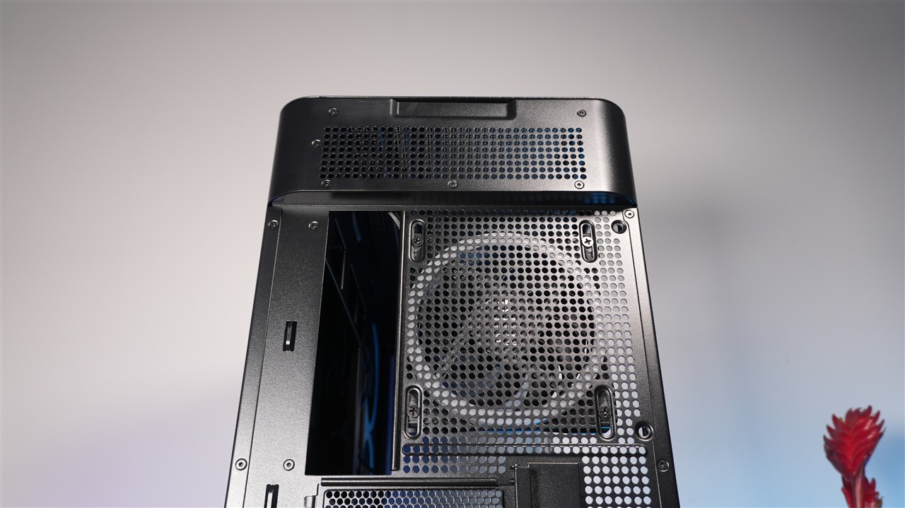 Górną część obudowy Endorfy Aquarius 8000 Corona przykrywa blaszany panel z mocną perforacją. Jego mocowanie zostało zrealizowane za pomocą zatrzasków, więc w praktyce wystarczy tylko pociągnąć go w górę, by zszedł. Po spodem znajduje się z kolei miejsce montażu chłodnic lub wentylatorów. Co należy podkreślić, w tym miejscu zmieści się radiator o rozmiarze 420 mm lub 360 mm. Można też alternatywnie zamontować same wentylatory: 3 x 120 mm albo 3 x 140 mm. Jak się spodziewałem, w tym miejscu nie uświadczymym żadnego filtra przeciwkurzowego. Akurat na górze nie jest on jakoś wybitnie potrzebny, ale gdyby był