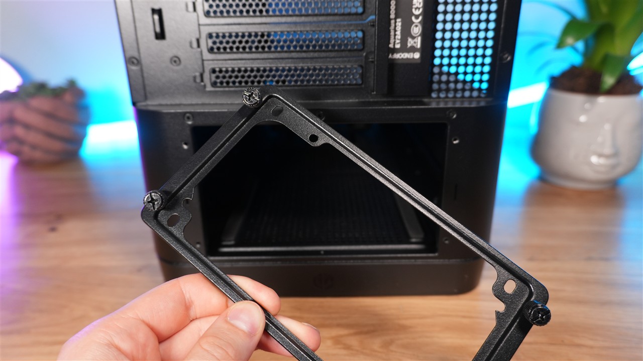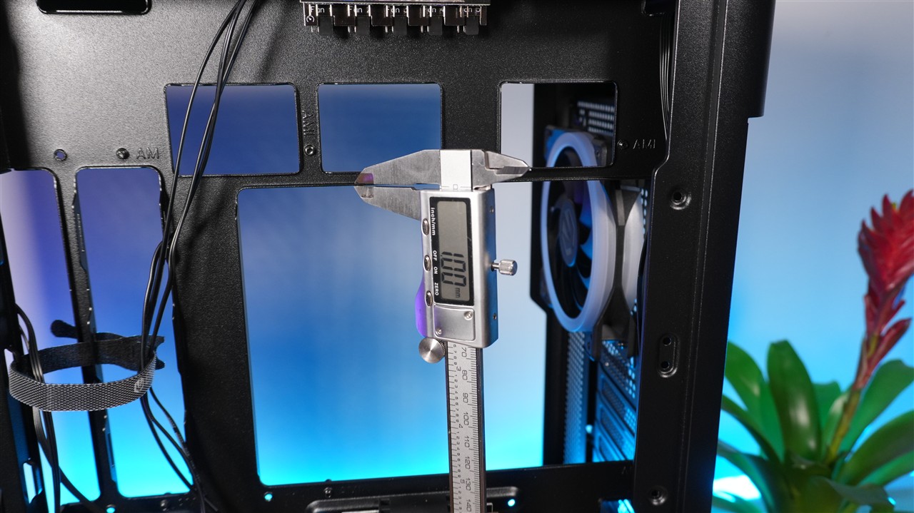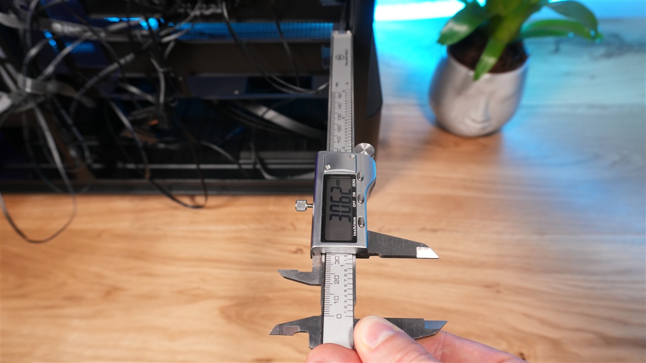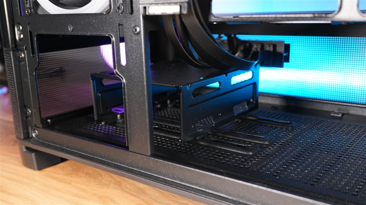 Za tacką płyty głównej znajduje się około 31 mm miejsca dla okablowania. To w zupełności wystarczająca ilość. Suwmiarka wskazała także grubość blachy na poziomie ok. 1 mm. To naprawdę solidny wynik. Z tyłu, w komorze zasilacza, znalazło się miejsce dla niewielkiej klatki na dyski. Zmieści ona jeden nośnik w rozmiarz 2,5 cala oraz dwa 3,5-calowe. Co ważne, klatkę można łatwo zdemontować przesuwając ją do otworów zlokalizowanych na szynie. Istnieje także opcja jej przesunięcie z wykorzystaniem wspomnianych przed chwilą szyn. Co do innych miejsc dedykowanych montażowi dysków, za wycięciem dla chłodzenia procesora można przymocować dwie sztuki w rozmiarze 2,5 cala.