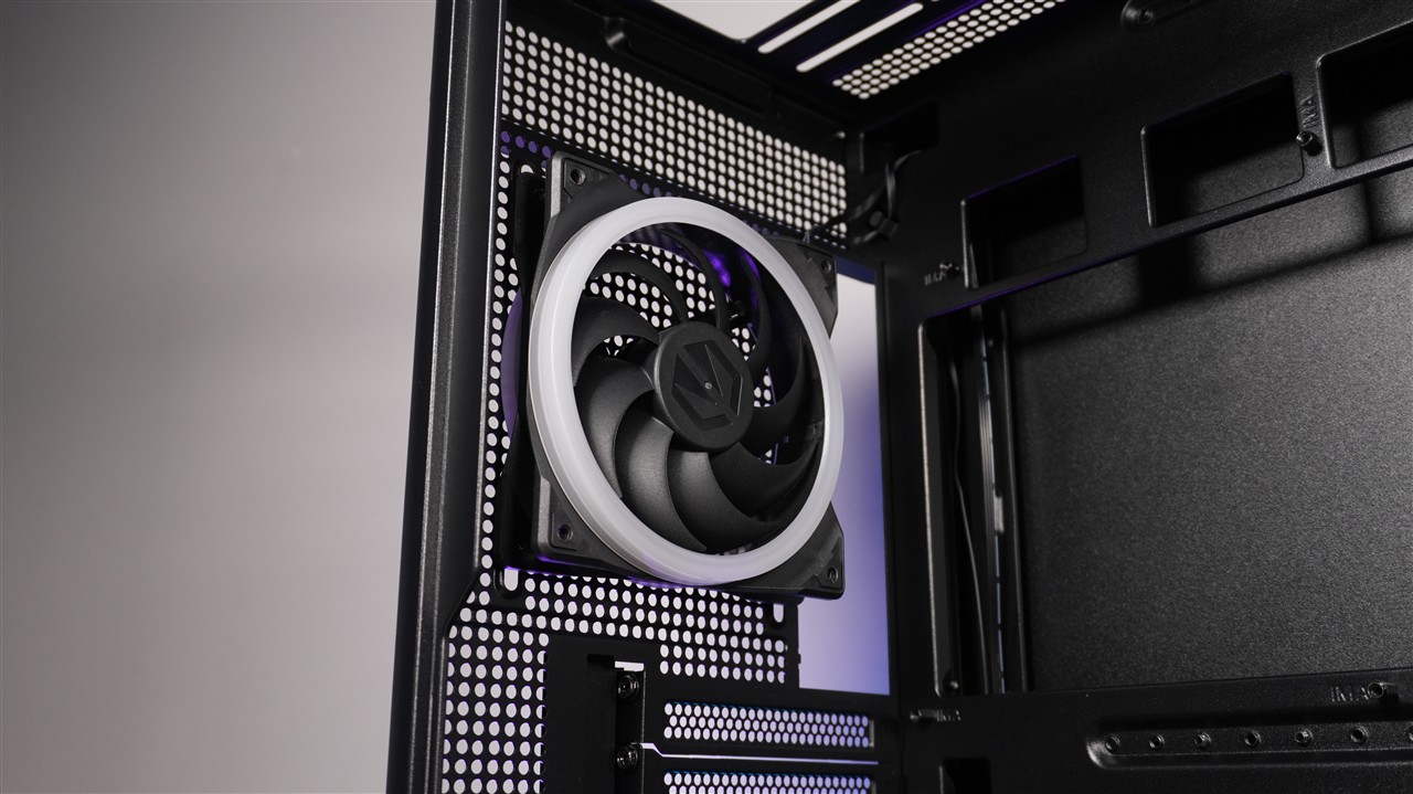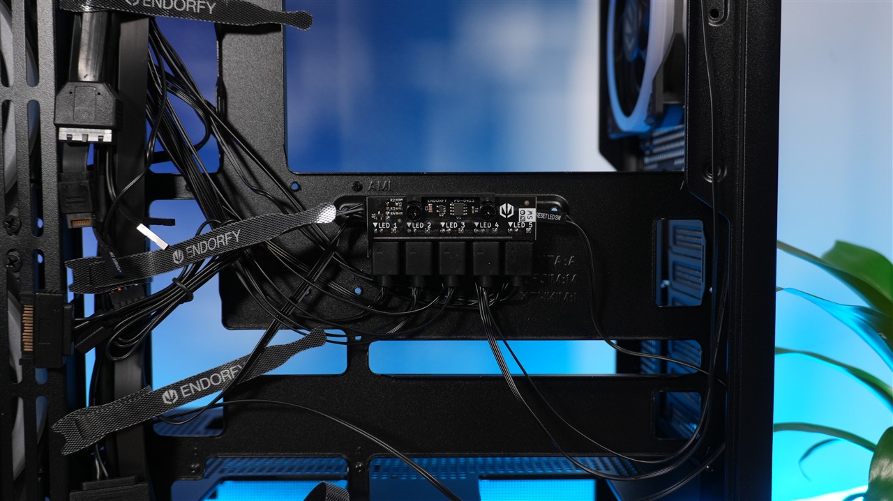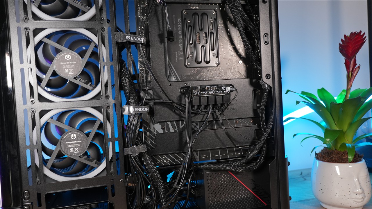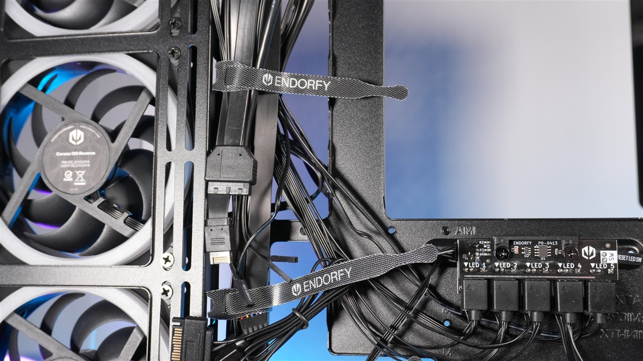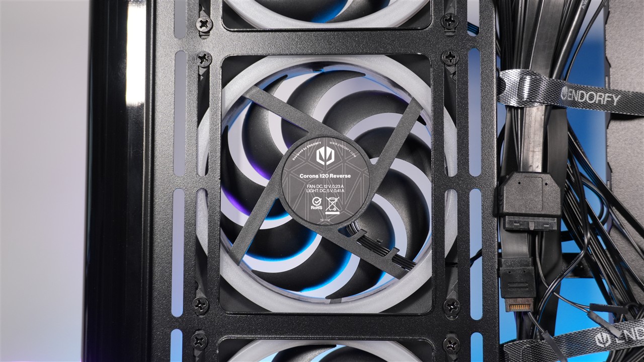 Fabrycznie obudowa Endorfgy posiada cztery wentylatory Corona 120. Trzy sztuki umieszczone na boku posiadają w nazwie dopisek „Reverse”, co oznacza, że ich łopatki są odwrócone i tym samym wentylatory zaciągają powietrze do środka, a nie je wypychają. Każdy z wentylatorów posiada sterowanie PWM i podświetlenie ARGB. Z pomiarów w trakcie testów wynika, że maksymalna prędkość wynosi około 1503 RPM.