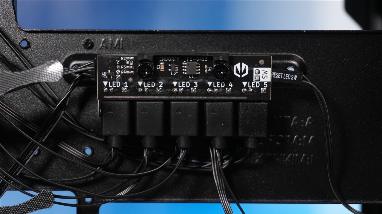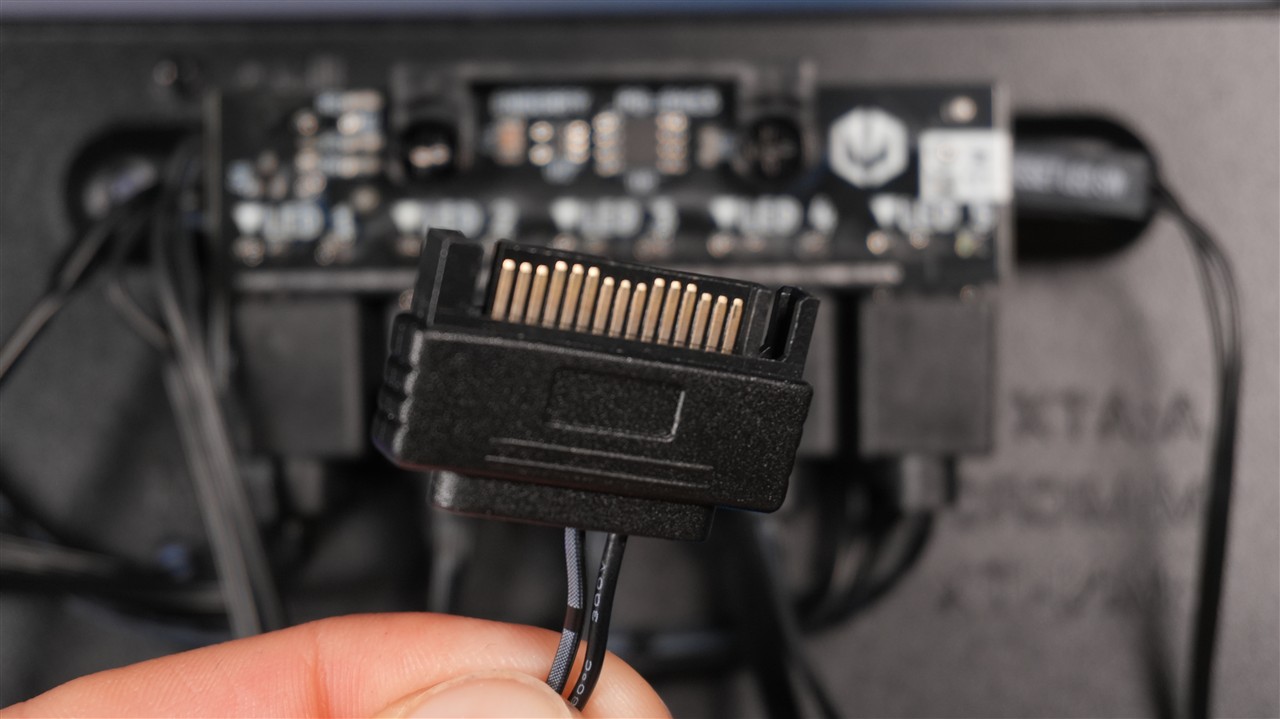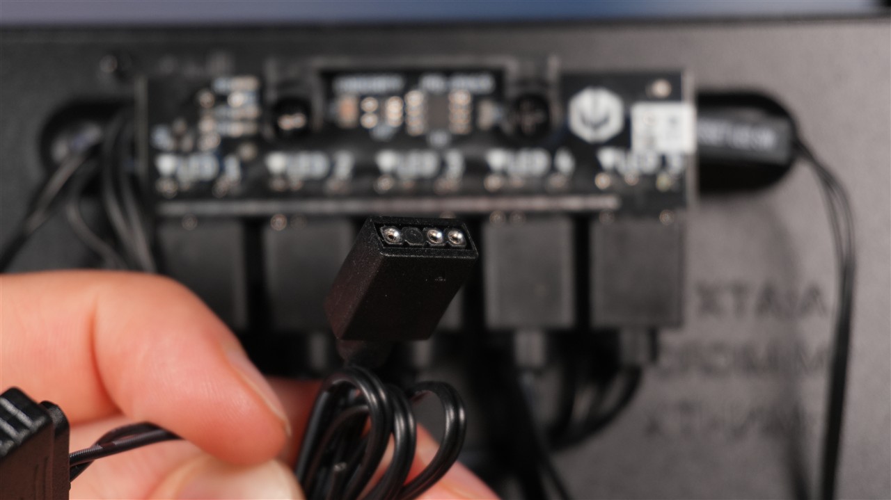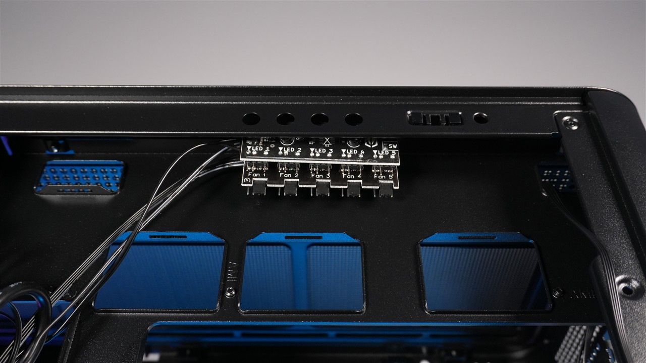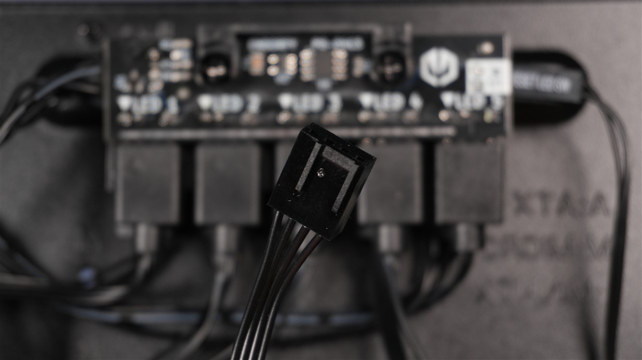 Warto jeszcze zwrócić uwagę na dwa kontrolery. Dwie niewielki płytki drukowane zostały przyczepione mniej więcej pośrodku wysokości oraz na samej górze. Są one niemalże identyczne - każdy posiada 5 złączy dla wentylatorów (PWM) i 5 dla podświetlenia. Można dzięki temu w prosty sposób dołożyć kolejne wentylatory. Dodam jeszcze, że kontrolery są zasilane przy pomocy złącza SATA, mają wyprowadzenie PWM do płyty głównej, a ten umieszczony niżej również wyprowadzenie 3-pin ARGB.