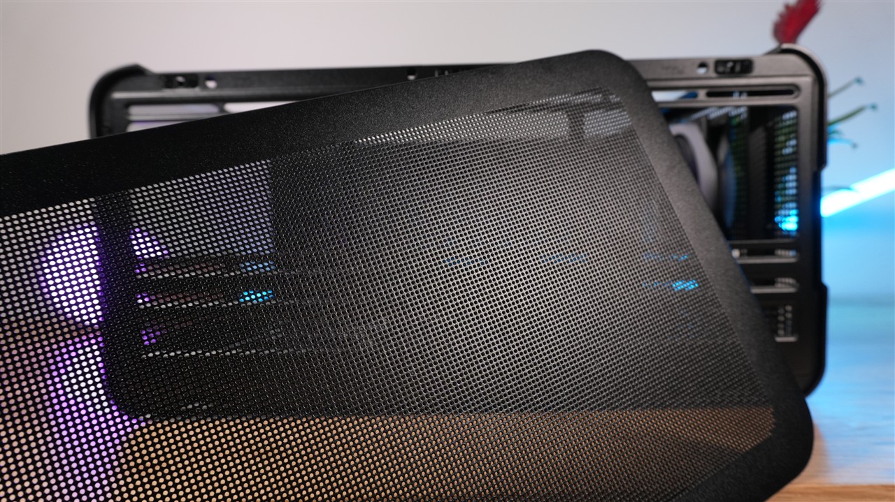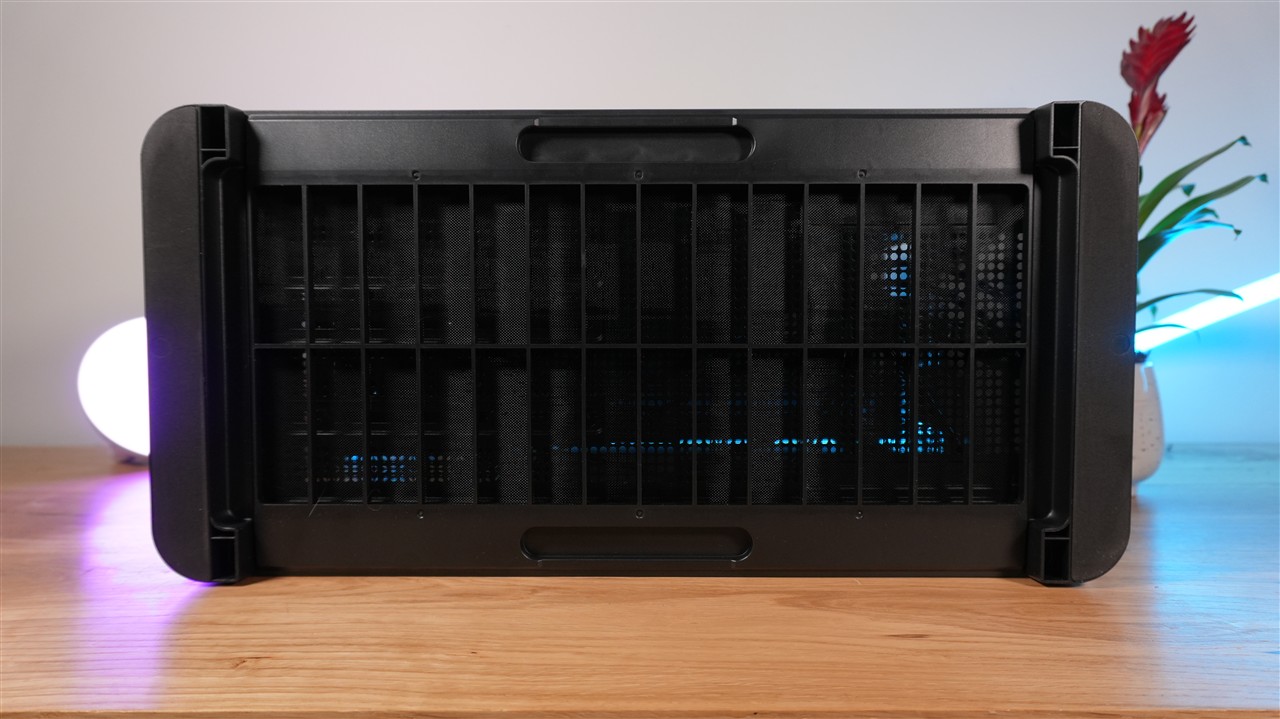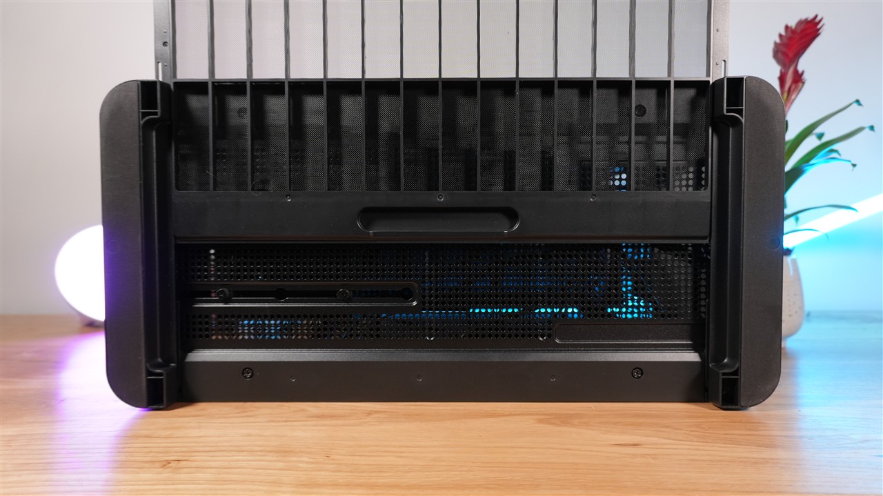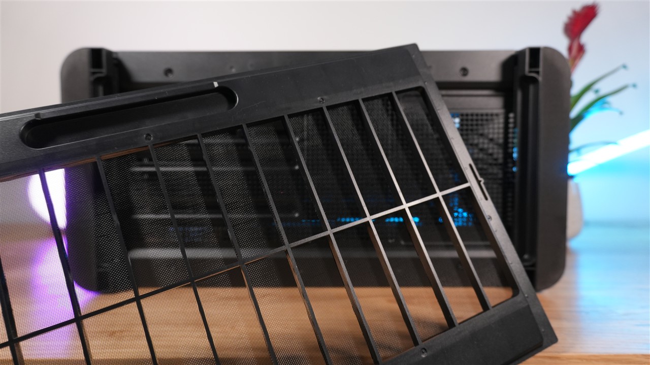 Ta część recenzowanej obudowy akurat bardzo pozytywnie mnie zaskoczyła. A jest tak, ponieważ niemalże cały spód przykrywa filtr siateczkowy z drobnymi oczkami. To skuteczne zabezpieczenie przed kurzem. Na dodatek filtr można łatwo wyjąć i ponownie zamontować bez obracania obudowy na bok. Jest to możliwe dzięki rączkom dostępnym z dwóch stron. Pokaźnych rozmiarów filtr nie dziwi natomiast jeśli spojrzymy co kryje się pod nim. Praktycznie cały spód obudowy posiada otwory wentylacyjne. To zaleta biorąc pod uwagę, że perforowana jest również komora zasilacza.