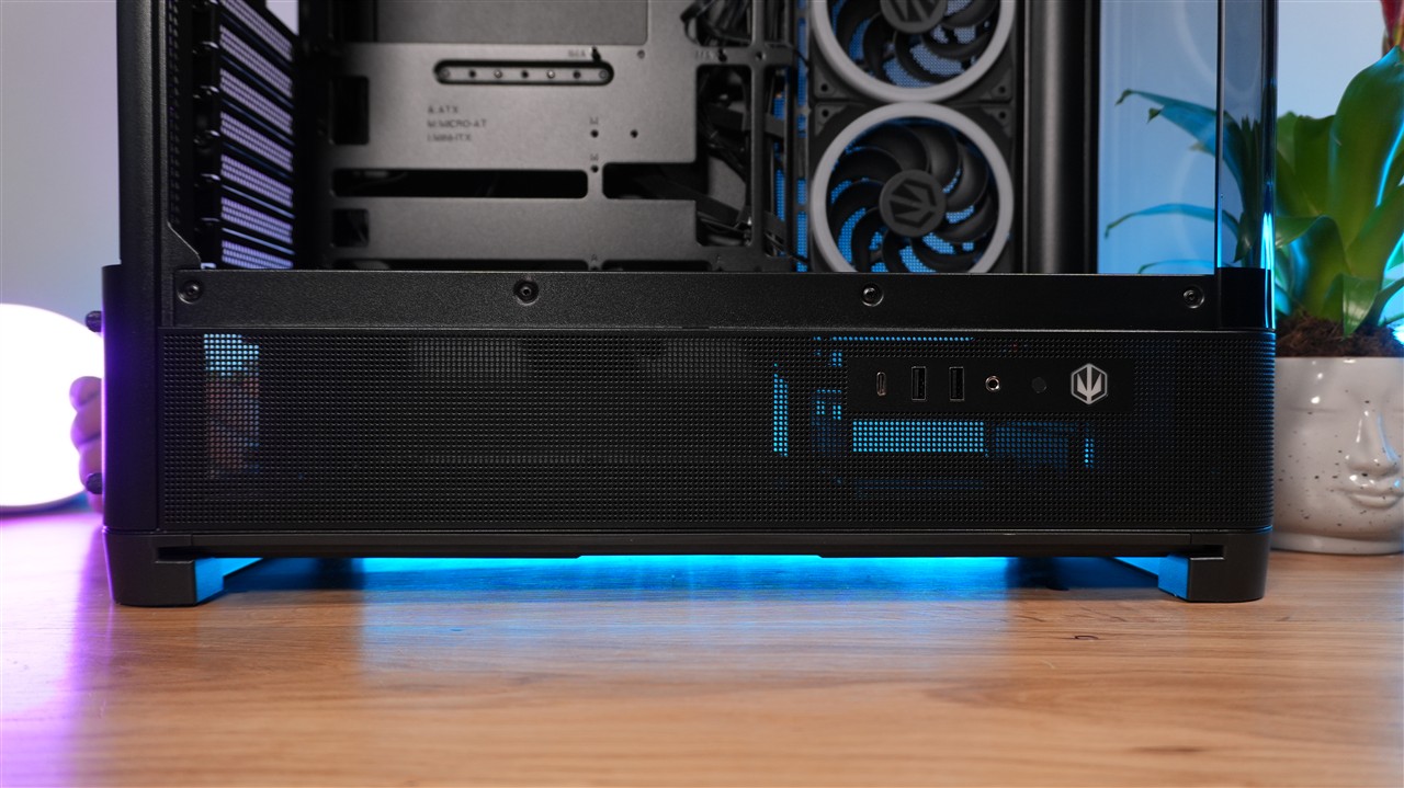Frontem obudowy w tym przypadku jest panel ze szkła hartowanego. Mogę jedynie dodać, że przymocowano go za pomocą czterech śrubek, więc nie mamy beznarzędziowej opcji jego demontażu, jak w przypadku innych paneli. Tuż pod samym szkłem znajduje się natomiast niewielki kawałek blachy z otworami wentylacyjnymi, a jeszcze niżej wytłoczone logo marki Endorfy.