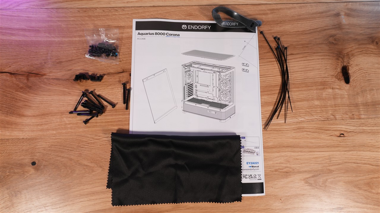 Pakiet akcesoriów nie jest tutaj przesadnie bogaty. Otrzymujemy podstawowy zestaw śrubek umożliwiający złożenie komputera i szczegółową instrukcję z dokładnymi obrazkami (to cieszy). W zestawie znajdziemy jeszcze niewielką ściereczkę z mikrofibry, która przy obecności takiej ilości szkła może okazać się przydatnym dodatkiem. Producenci potrafią już dołączać śrubokręty do swoich obudów, kto wie, może następnym krokiem będzie buteleczka z płynem do szyb?