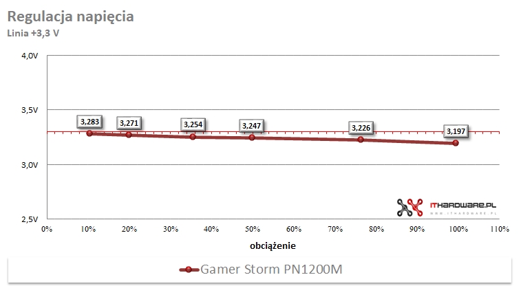 Zobaczmy, jak wyglądała regulacja napięć na poszczególnych liniach. Napięcia 3,3 V, 5 V i 12 V zostały oznaczone na wykresach czerwoną linią. Producenci dążą do tego, by regulacja na wszystkich liniach nie przekraczała 3%. Jest to typowe podejście dla zasilaczy ze średniej i niskiej półki cenowej. W hi-endzie wymaga się, by nie przekraczała 1%.