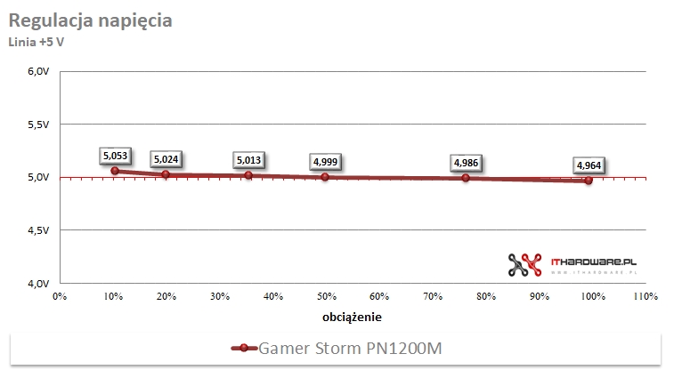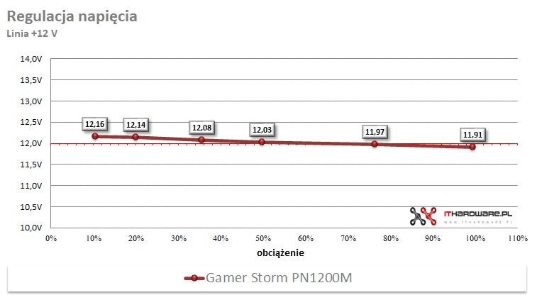 Regulacja napięć w zasilaczu Gamer Storm PN1200M utrzymuje się na dobrym poziomie i bez problemu mieści się w granicach specyfikacji ATX. Dla linii +3,3 V odnotowano maksymalne odchylenie na poziomie 2,62%, natomiast w przypadku +5 V regulacja wyniosła 1,76%. Kluczowa linia +12 V cechowała się stabilnością na poziomie 2,06%.