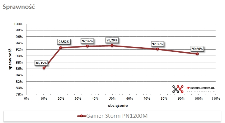 W standardowym zakresie obciążeń, od około 10% do 110% mocy znamionowej, zasilacz Gamer Storm PN1200M osiąga najwyższą sprawność przy obciążeniu zbliżonym do 35%–50%, gdzie wyniosła ona odpowiednio 92,96% (T3) oraz 93,20% (T4). W przedziale od około 20% do 75% mocy znamionowej sprawność utrzymywała się na poziomie 92,52%–92,06%. Przy obciążeniu znamionowym (T6) sprawność wyniosła 90,60%, natomiast w teście przeciążeniowym (110%) spadła do 89,86% przy mocy oddanej 1332,6 W.