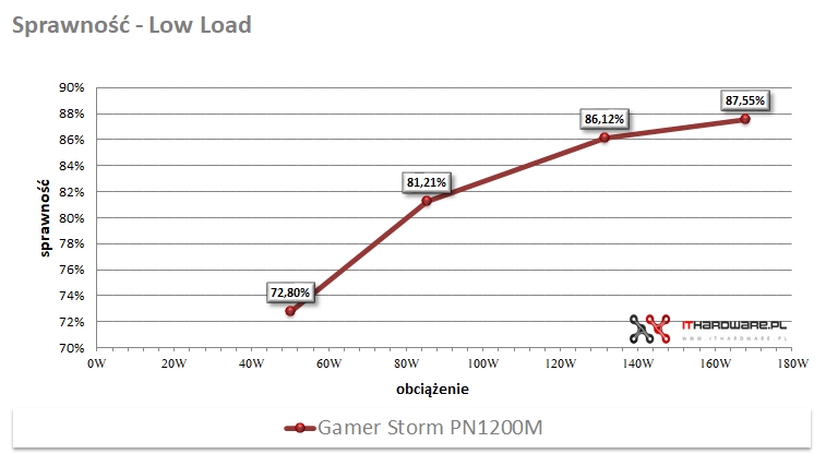 W testach niskiego obciążenia sprawność zasilacza Gamer Storm PN1200M rozpoczynała się od 72,80% przy około 4,19% obciążenia (LP1), by wzrosnąć do 87,55% przy obciążeniu wynoszącym 13,99% (LP4). Charakterystyka sprawności przy niskich obciążeniach jest typowa dla jednostek o wysokiej mocy znamionowej.