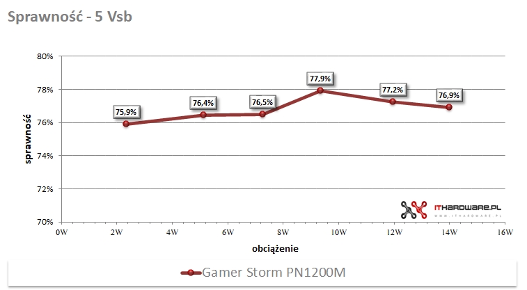 W zakresie linii pomocniczej +5 VSB zasilacz Gamer Storm PN1200M osiągał sprawność od 75,9% (T1) do 77,9% (T4), przy napięciu mieszczącym się w zakresie 5,007–4,92 V.