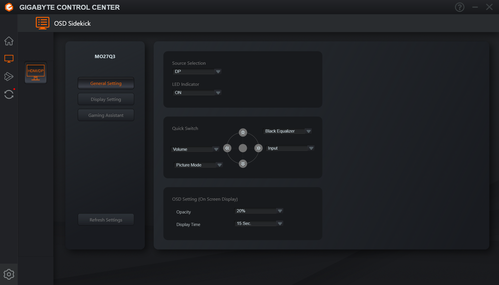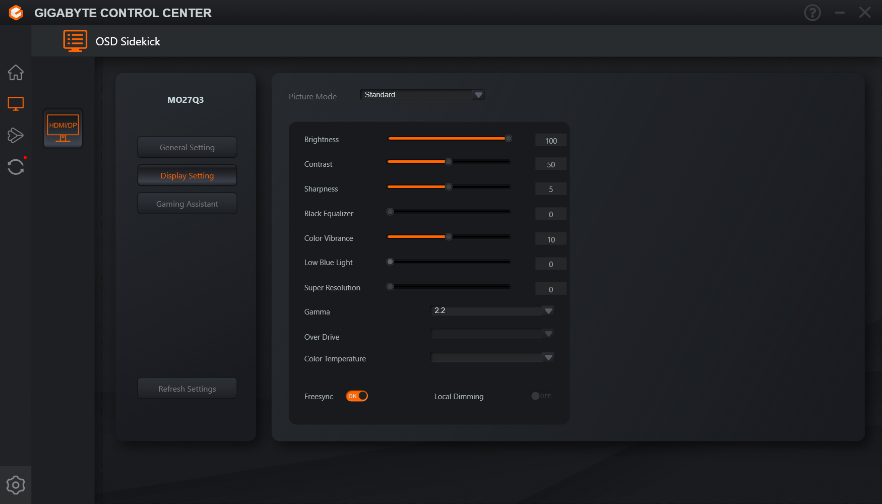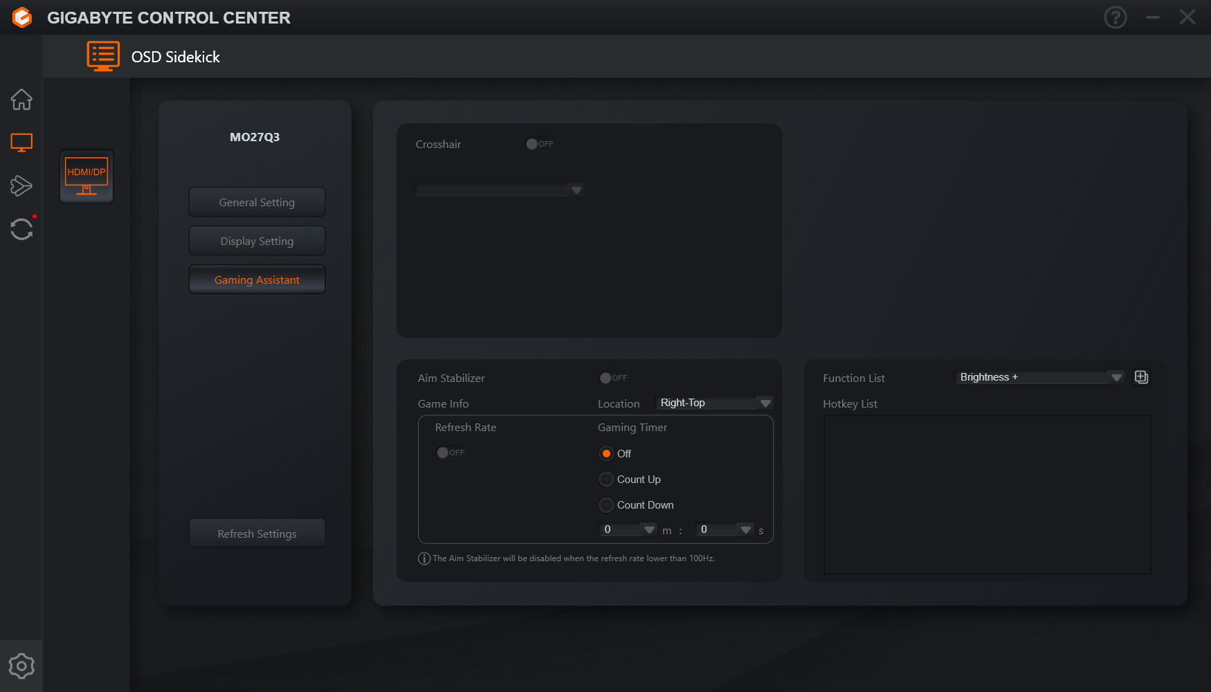 Na osobne wyróżnienie zasługuje zakładka GameAssist, która oferuje cały zestaw dodatków dla graczy, takich jak ekranowy licznik czasu, licznik zdarzeń, wyświetlanie częstotliwości odświeżania, kilka wariantów celownika czy funkcja Eagle Eye, pozwalająca powiększyć wybrany fragment obrazu. Wspomniany przycisk taktyczny domyślnie służy do szybkiej zmiany rozdzielczości do rozmiaru ekranu (możemy szybko zawęzić obraz np. do 24 cali w Full HD, co jest popularną opcją wśród e-sportowców), ale można przypisać mu także inne funkcje gamingowe, co zwiększa jego praktyczność. Dodatkowym atutem pozostaje możliwość obsługi wszystkich ustawień z poziomu aplikacji Gigabyte Control Center, co w praktyce okazuje się jeszcze wygodniejsze niż klasyczna nawigacja po OSD.