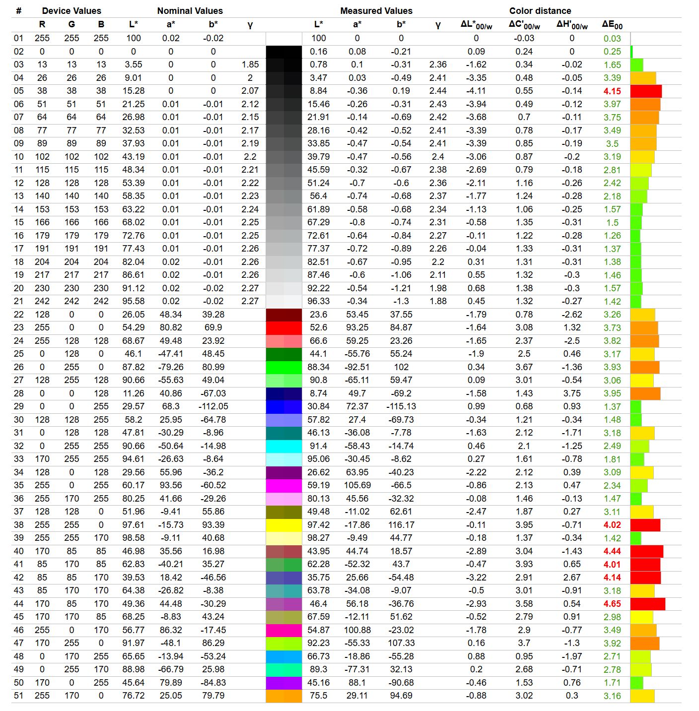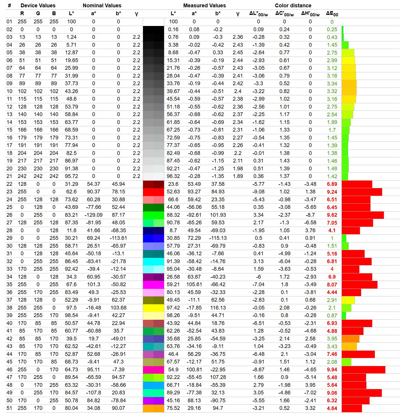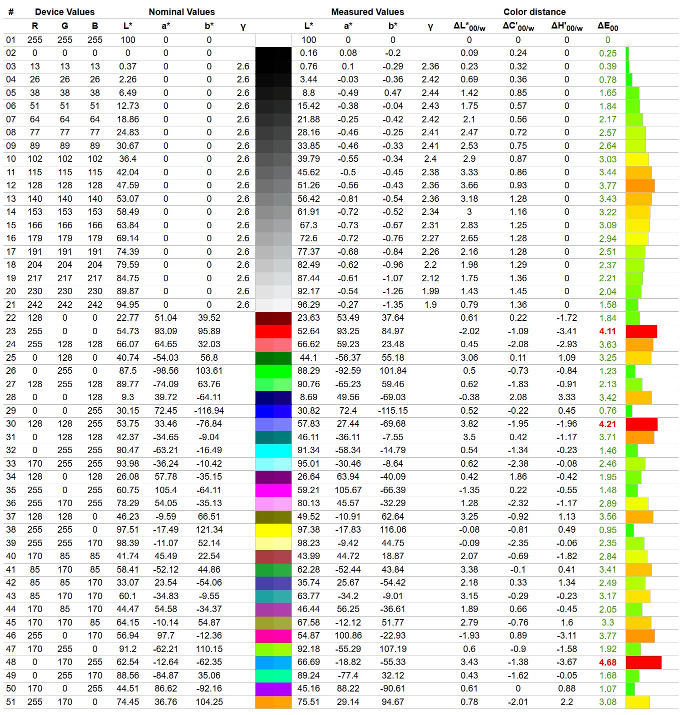 Jak wiadomo profilowanie monitorów nigdy nie jest bezstratne - im większa ilość błędów, tym większy uszczerbek w szarościach (schodkowanie gradientów) i mniej kolorów możliwych do wyświetlenia, a trzeba też pamiętać, że mamy tu do czynienia z 8-bitowym panelem. Niemniej jednak iiyama G-Master G4380UHSU-B2 Red Eagle dobrze reaguje na kalibrowanie, dzięki czemu można spadek średniego błędu Delta E do jedynie 0,46, to z racji tego, że krzywe korekcyjne nie znajdują się tak daleko od wzorcowego przebiegu. Poza tym banding nie jest w tym przypadku mocno dokuczliwy.