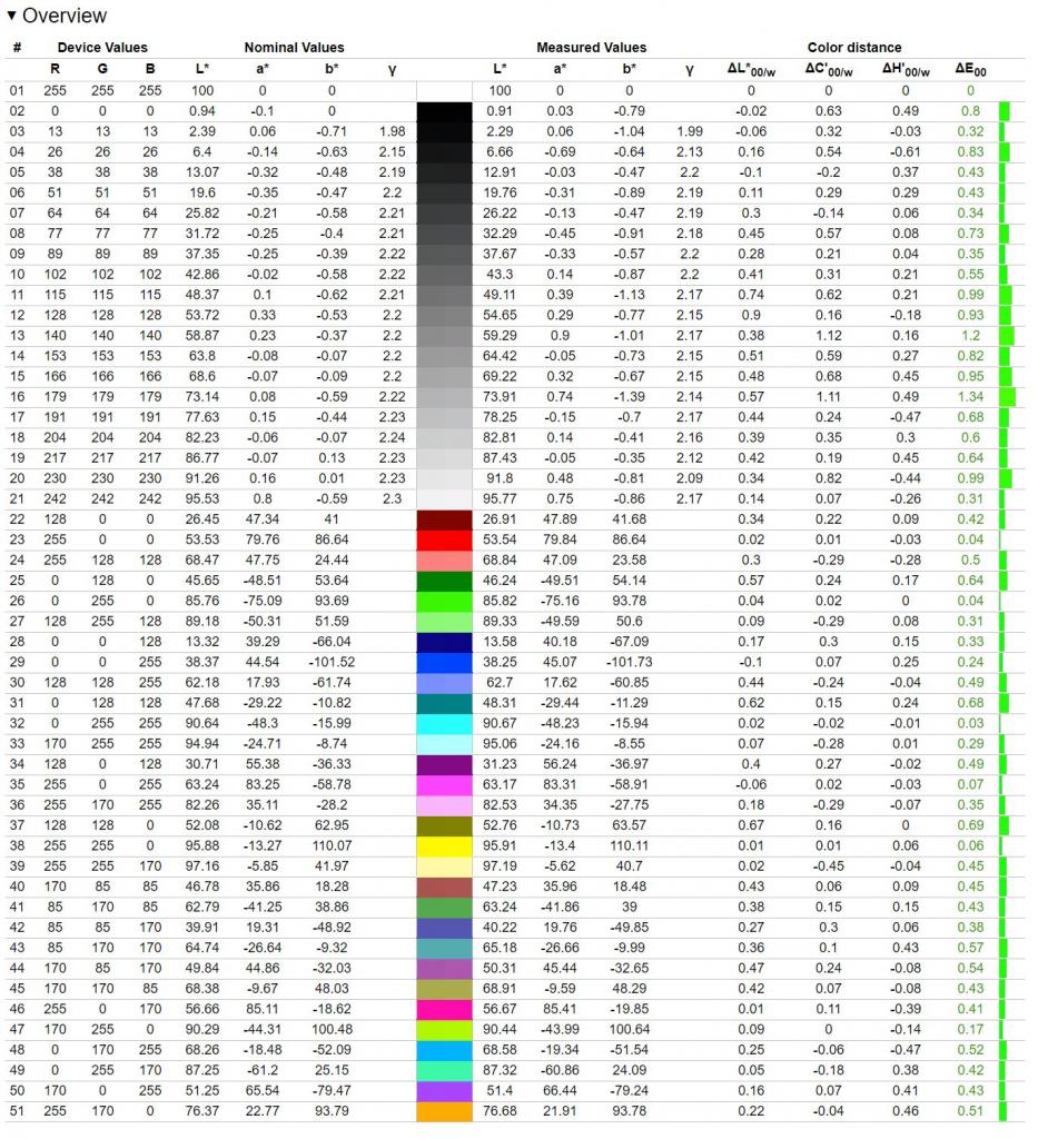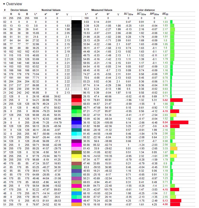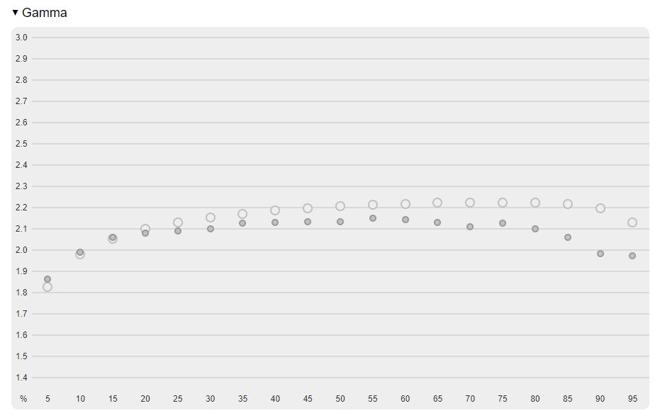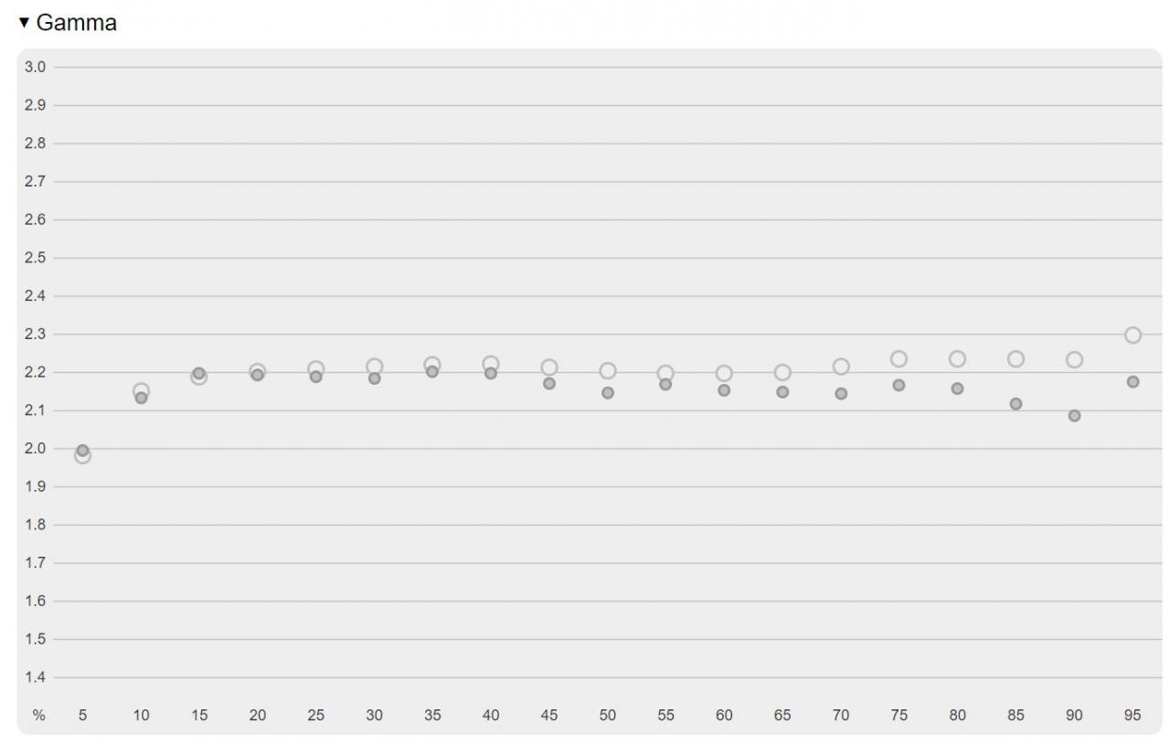 Fabrycznie monitor ma ustawioną luminancję na 80%, co oznacza: 435,6,5 cd/m2 dla bieli, a także 0,3964 cd/m2 dla czerni. Już na tym etapie jasność okazała się wyższa niż w oficjalnej specyfikacji, co akurat uznać trzeba za plus. Warto zauważyć, że kontrast wynosi tym samym 1098,6:1, czyli jest zgodny z deklaracjami producenta. Biel jest zaś blisko ideału, bo przy 6394 K trudno wyczuć ocieplenie (przebarwienie jest marginalne, na które uwagę zwrócą tylko najwięksi puryści). Gorzej jest z precyzją odwzorowania kolorów - co prawda średni błąd Delta E wynosi tylko 2,06, ale najwyższe odchylenia notowane są w podstawowych kolorach, przede wszystkim na czystym niebieskim, gdzie wynosi ono 8,54, więc na poprawną reprodukcję nie ma co liczyć. Czerwień i zieleń notują błąd wynikający głównie z nasycenia, błękit zaś z braków gamutowych. Pochwalić trzeba jednak liniowości, gdyż domyślny przebieg gammy lokalnej wypada dobrze.