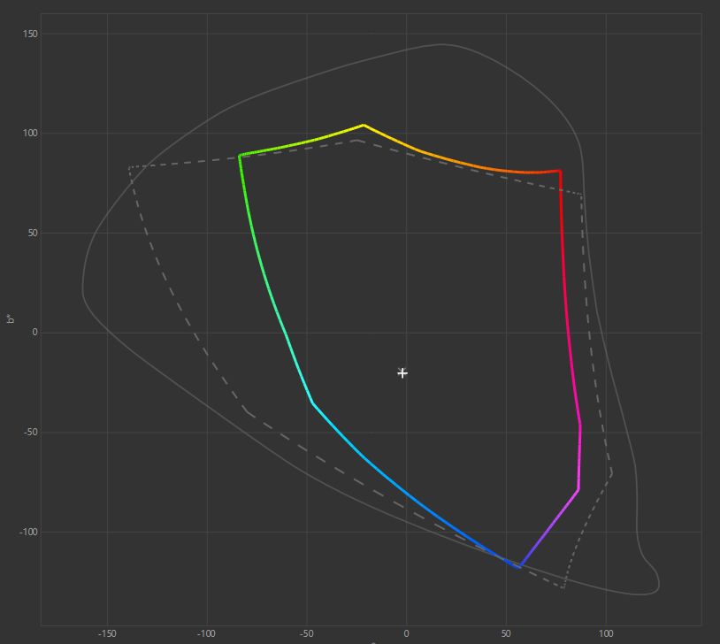 Na początek prób z kolorymetrem - gamut barwny. Ten pokrywa 93,9% przestrzeni sRGB, charakteryzując się jednocześnie całkowitą objętością równą 103% tejże przestrzeni. Całość dobrze obrazuje poniższa bryła, gdzie zawyżona saturacja widoczna jest przede wszystkim w zielonym i czerwonym kanale, jest to jednak zjawisko pożądane przez zdecydowaną większość użytkowników domowych. Dla Adobe RGB uzyskaliśmy pokrycie na poziomie 68,7% przy objętości równej 70,9%, a dla DCI-P3 odpowiednio 72,9% oraz 72,9%. Co ciekawe, wyniki te są zauważalnie lepsze od poprzednika, ale też nie odstają jakoś mocno od tego, co zaobserwowaliśmy w modelu G-Master GB2570HSU-B1 Red Eagle, czyli odpowiedniku bazującym na matrycy IPS. Jak na tej klasy konsumencki monitor do gier, uznać trzeba je za naprawdę przyzwoite.