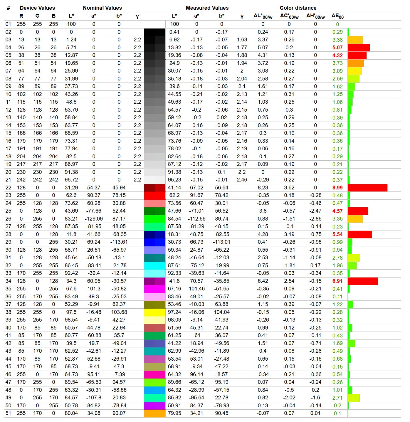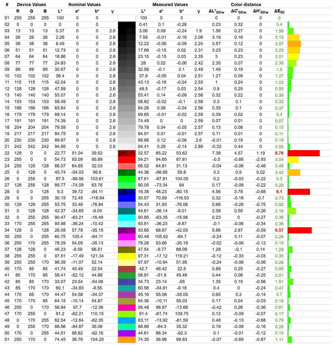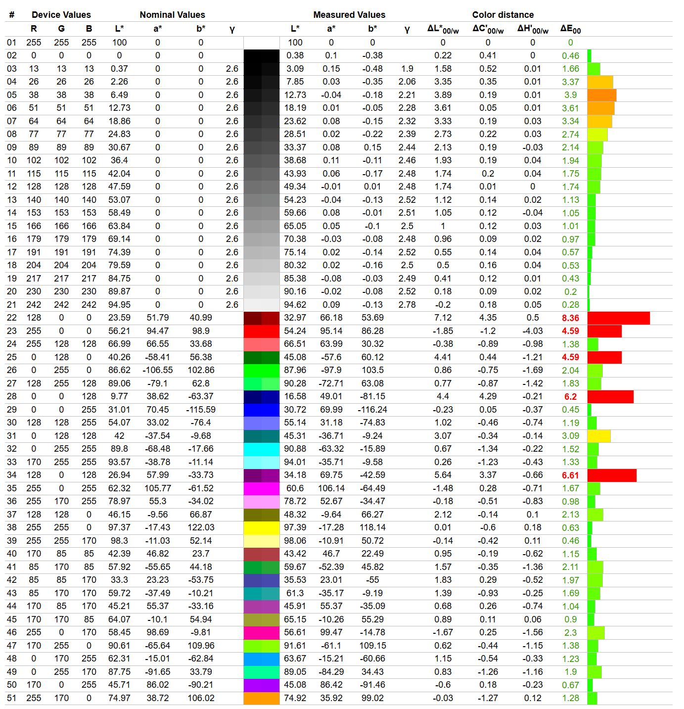 Tu dochodzimy do pomiaru błędów Delta E, czyli dokładności w odwzorowaniu kolorów. Wraz z monitorami otrzymaliśmy raporty z pomiaru, które sugerowały niezwykle niskie błędy na poziomie 0,1 dla przestrzeni sRGB. Jak to jednak przeważnie bywa z takimi raportami (przynajmniej z naszego doświadczenia), rzadko pokrywają się z naszymi pomiarami, co tłumaczyć można zarówno innym sprzętem pomiarowym (my wykorzystujemy kolorymetr X-Rite i1Display, z kolei iiyama znacznie droższy Minolta Color Analyzer CA410), ale i metodologią, a nie znamy też ustawień producenta przy pomiarach. Niemniej jednak, oba monitory ProGraphic w naszych testach wciąż uzyskały naprawdę dobre wyniki, bo Delta E dla sRGB wyniosło 1,26 i 1,98 dla odpowiednio 27-calowego i 32-calowego modelu (więcej wyników w tabeli poniżej). Problem jednak w tym, że największy błąd sięgał ok. 8 i dotyczył czerwieni, więc dodatkowa kalibracja jest raczej wskazana. Inna sprawa, że w przypadku monitorów dla profesjonalistów zawsze warto się o takową pokusić, a obecnie nie jest to wcale taki duży koszt (szczególnie w kontekście sprzętu, na którym zamierzamy pracować).