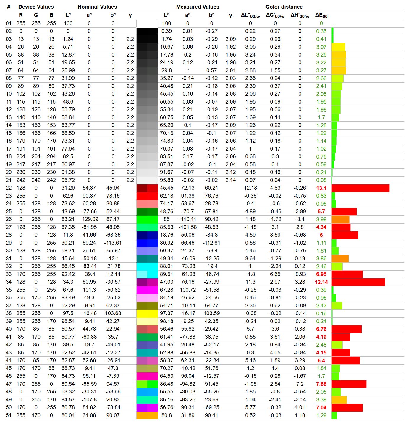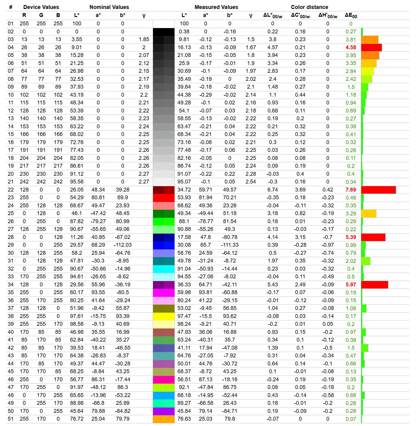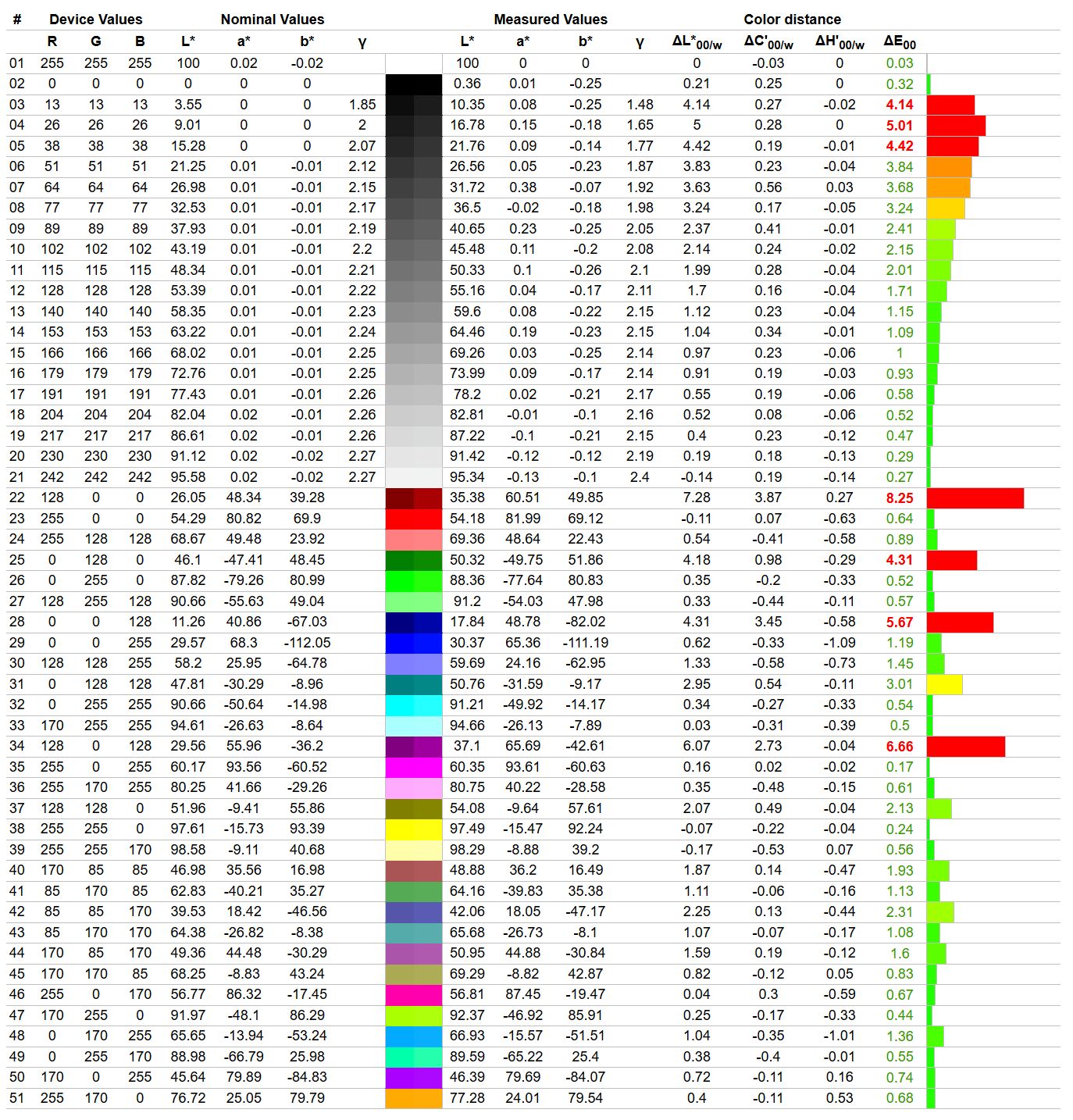 Tu dochodzimy do pomiaru błędów Delta E, czyli dokładności w odwzorowaniu kolorów. Wraz z monitorami otrzymaliśmy raporty z pomiaru, które sugerowały niezwykle niskie błędy na poziomie 0,1 dla przestrzeni sRGB. Jak to jednak przeważnie bywa z takimi raportami (przynajmniej z naszego doświadczenia), rzadko pokrywają się z naszymi pomiarami, co tłumaczyć można zarówno innym sprzętem pomiarowym (my wykorzystujemy kolorymetr X-Rite i1Display, z kolei iiyama znacznie droższy Minolta Color Analyzer CA410), ale i metodologią, a nie znamy też ustawień producenta przy pomiarach. Niemniej jednak, oba monitory ProGraphic w naszych testach wciąż uzyskały naprawdę dobre wyniki, bo Delta E dla sRGB wyniosło 1,26 i 1,98 dla odpowiednio 27-calowego i 32-calowego modelu (więcej wyników w tabeli poniżej). Problem jednak w tym, że największy błąd sięgał ok. 8 i dotyczył czerwieni, więc dodatkowa kalibracja jest raczej wskazana. Inna sprawa, że w przypadku monitorów dla profesjonalistów zawsze warto się o takową pokusić, a obecnie nie jest to wcale taki duży koszt (szczególnie w kontekście sprzętu, na którym zamierzamy pracować).