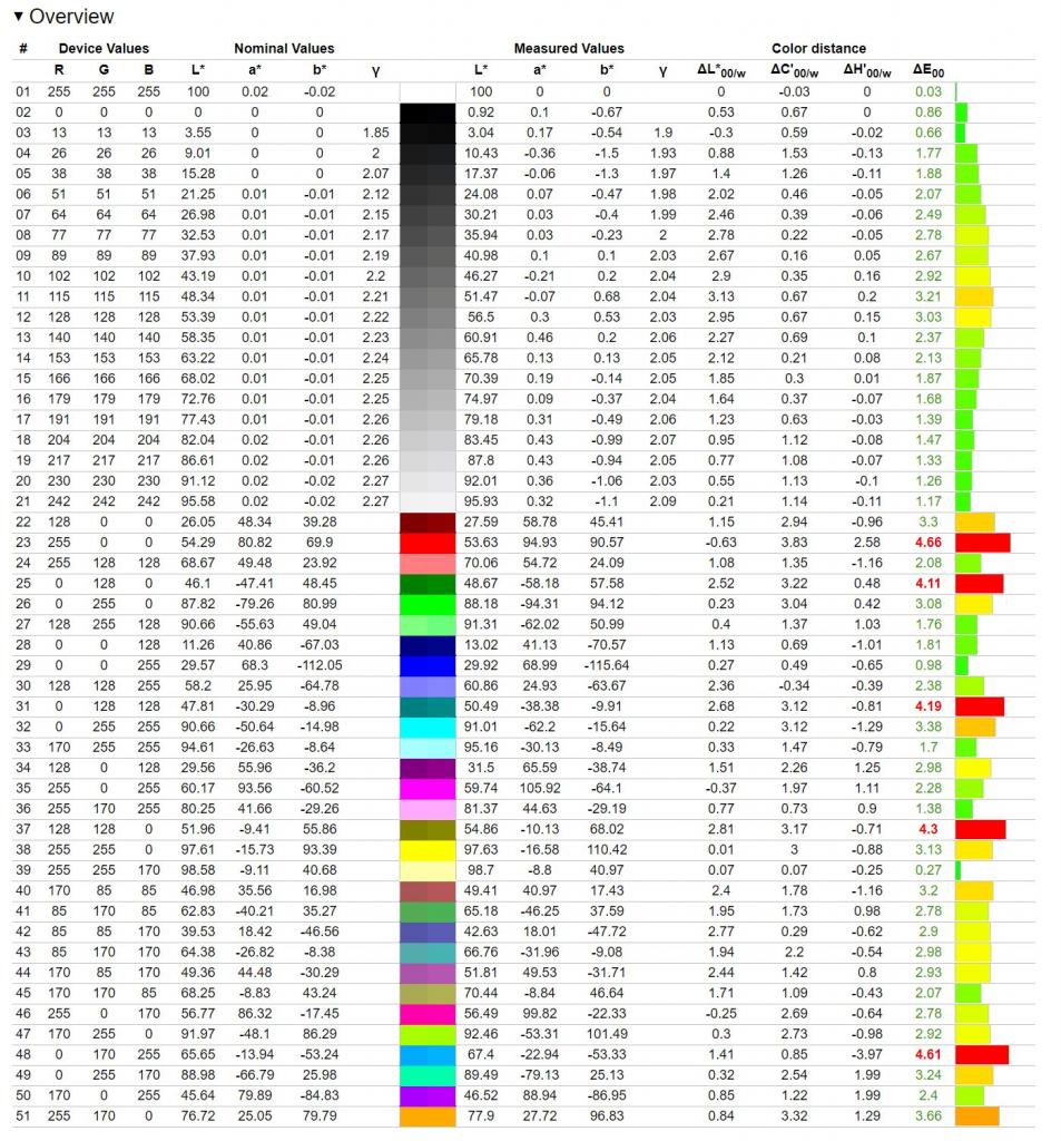 Monitor nie posiada wbudowanego trybu sRGB (a szkoda, bo mając na uwadze potencjał tego panelu, takowy byłby przydatny), ale dobrze reaguje na kalibrację i profilowanie. 100-stopniowe sterowanie składowymi RGB gwarantuje dużo lepszą precyzję, więc proces ten przebiega sprawnie. Co więcej, wyjściowe wartości RGB wymagały jedynie lekkiej korekcji zielonego i niebieskiego. Następnie postanowiliśmy mocno obniżyć jasność i co ciekawe uzyskanie podręcznikowych 120 cd/m2 następuje w tym przypadku przy wartości suwaka 30. Sam efekt kalibracji uznać można jednak za bardzo zadowalający, praktycznie w całej rozciągłości, gdyż zdecydowana większość parametrów oscyluje blisko pożądanych wartości, a na szczególną uwagę zasługuje średni błąd Delta E, wynoszący tylko 0,38. Zastosowany panel IPS przekłada się zaś na świetny gradient kolorów, pozbawiony bandingu. Tym samym monitor posłużyć może nie tylko graczom, ale i grafikom-amatorom.