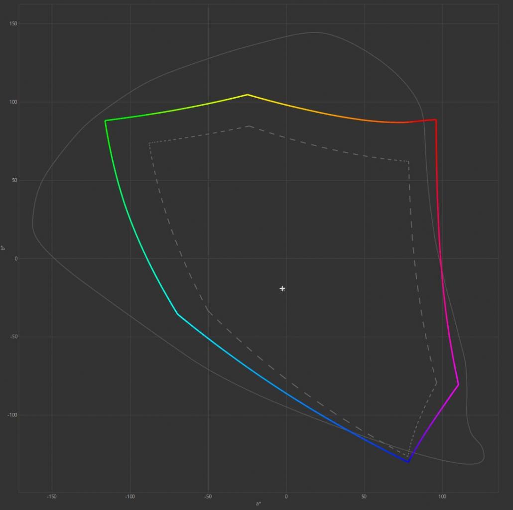 Pora przejść do pozytywów, bo choć nie mieliśmy dużych oczekiwań względem odwzorowania kolorów przez KFA2 Vivance-01, ten okazał się sporym zaskoczeniem w tym aspekcie. Warto dodać, że monitor obsługuje 10-bitową głębię kolorów, a producent obiecuje 99% pokrycie standardu sRGB i 95% DCI-P3, więc powinniśmy otrzymać szerokogamutowy panel. Tradycyjnie zaczynamy od pomiarów gamutu barwowego. Ten w przypadku KFA2 Vivance-01 (VI-01) wypada wręcz rewelacyjnie jak na monitor dla graczy, gdyż zgodność z przestrzenią sRGB, zgodnie z deklaracją producenta, jest praktycznie pełna i wynosi aż 99,8%, przy całkowitej objętości gamutu równej aż 141,8% sRGB. Dla standardu Adobe RGB wartości te wynoszą odpowiednio 88,1% i 97,7%, natomiast dla DCI P3 94,2% i 100,5%. Mówimy więc o wyświetlaczu, który jest w stanie zadowolić nawet osoby parające się grafiką. Na oko barwy są bardzo nasycone i przyjemne i typowy gracz powinien być zadowolony z tego, co zobaczy po włączeniu monitora.