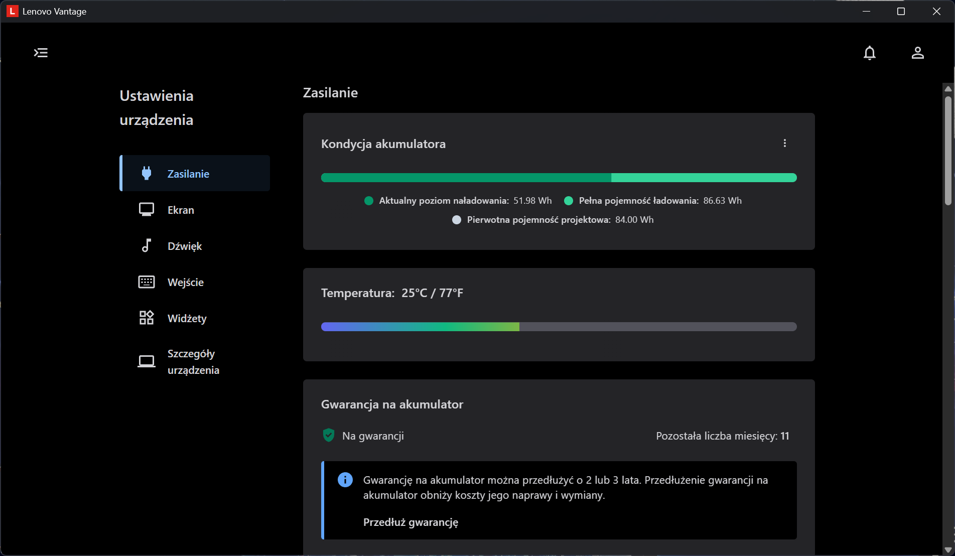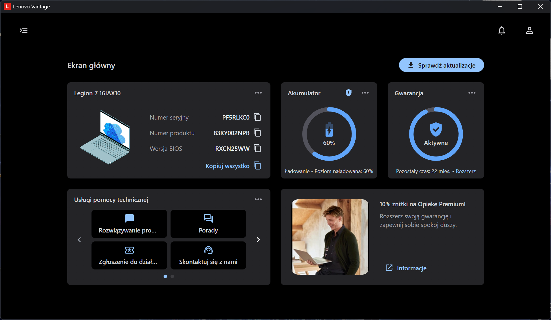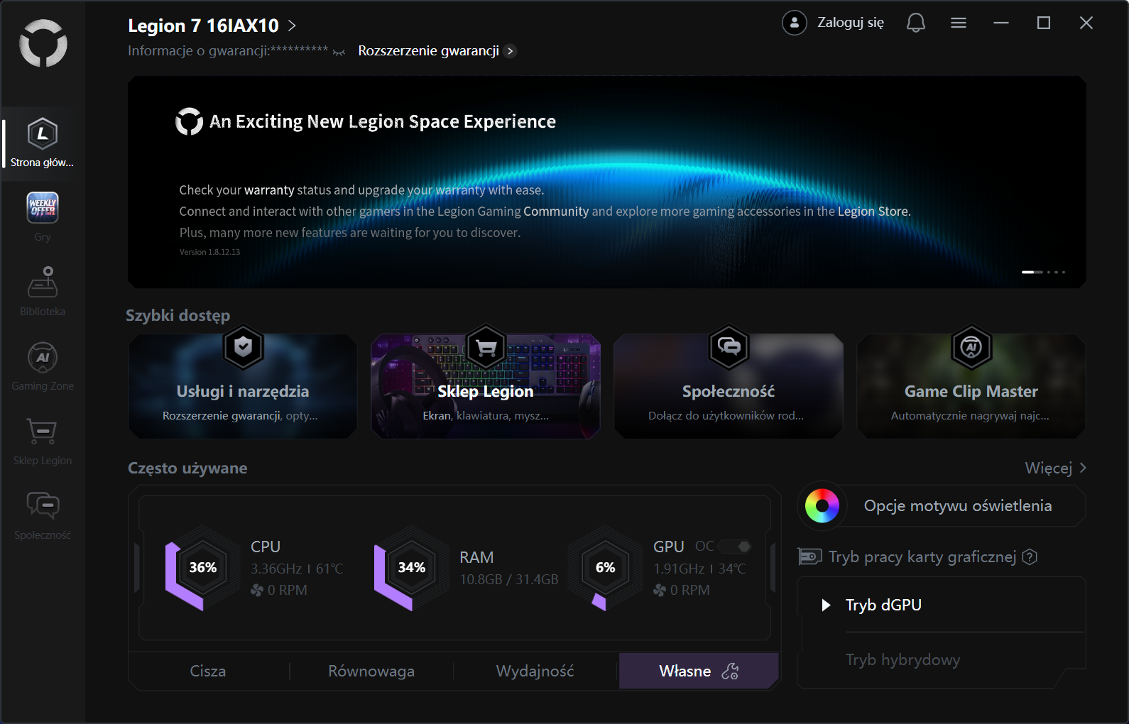 Jeśli zaś chodzi o oprogramowanie, to Lenovo naszym zdaniem nieco za bardzo zaśmieca dysk użytkownika. Poza tym, że sprzęt przychodzi z preinstalowanym antywirusem McAfee, otrzymujemy całą masę apek od samego producenta - od Lenovo Now, przez Lenovo Vantage i Lenovo AI Now po LegionSpace. Zdecydowanie lepszym wyjściem byłoby zintegrować te aplikacje w jedną, a przynajmniej Lenovo Vantage i LegionSpace. Z naszego punktu widzenia ta ostatnia jest najciekawsza, bo to swoiste centrum dowodzenia z możliwością wyboru trybu wydajnościowego (z własnym włącznie, gdzie sami ustawiamy poszczególne parametry), motywu podświetlenia czy MUX-a. Szkoda jednak, że przy okazji zalewani jestesmy reklamami i ofertami, więc w tym aspekcie Lenovo ma jeszcze sporo do poprawy.