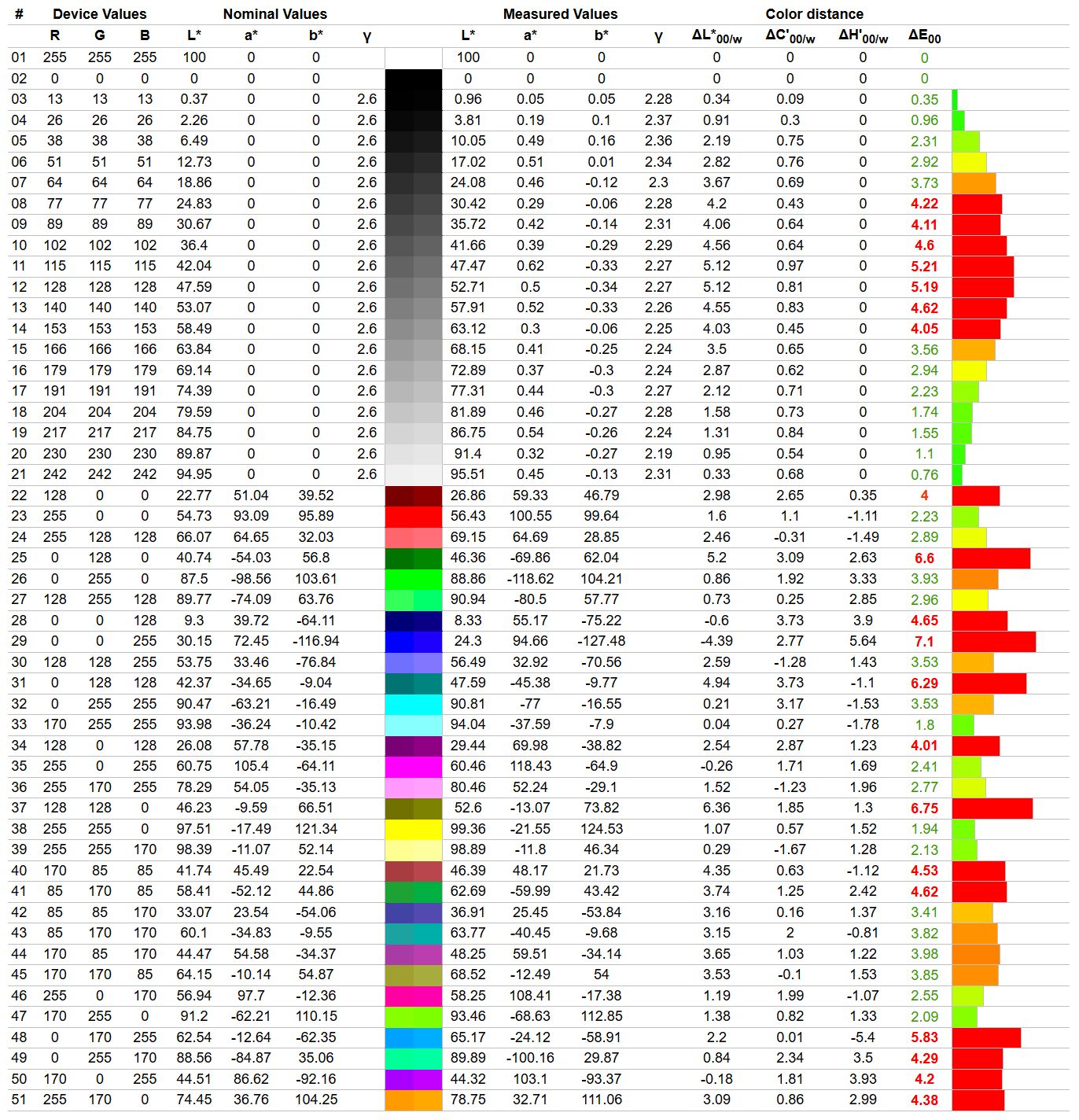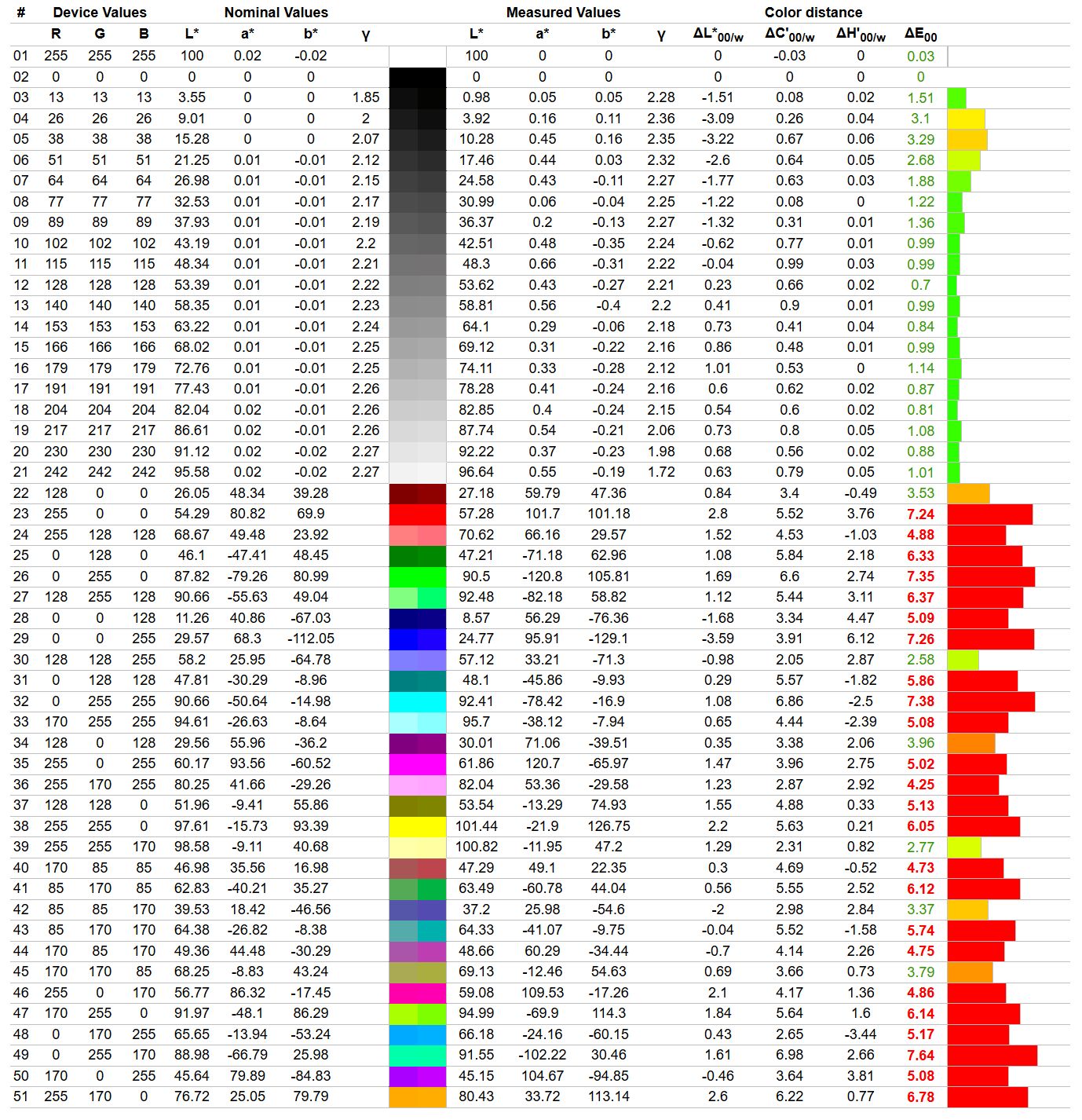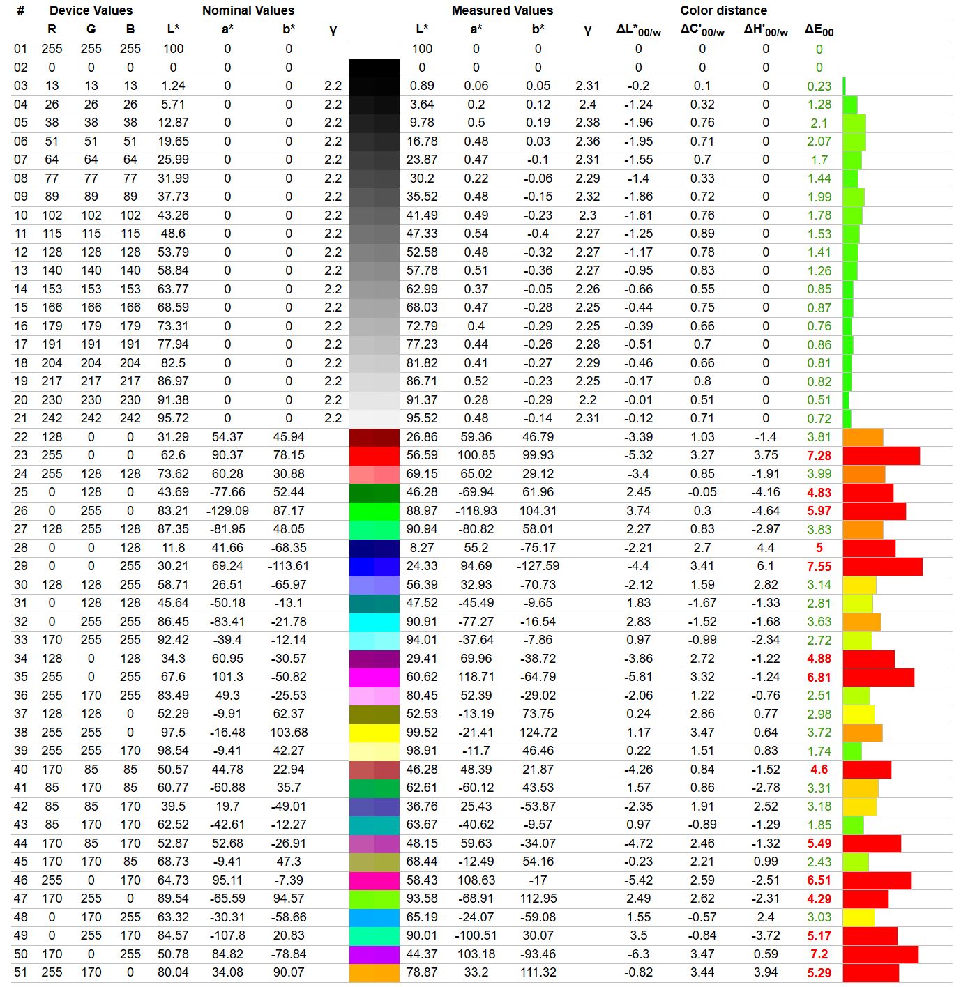 • Średni błąd Delta E dla sRGB: 1,21 (max. 2,3)