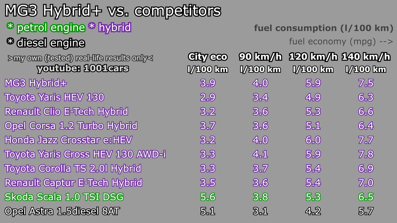 W efekcie, Skoda Fabia 1.0 TSI 115 KM 6MT wypadać powinna 0,5-1,0 l/100 km oszczędniej względem spalinowego MG3 1.5l 5MT.