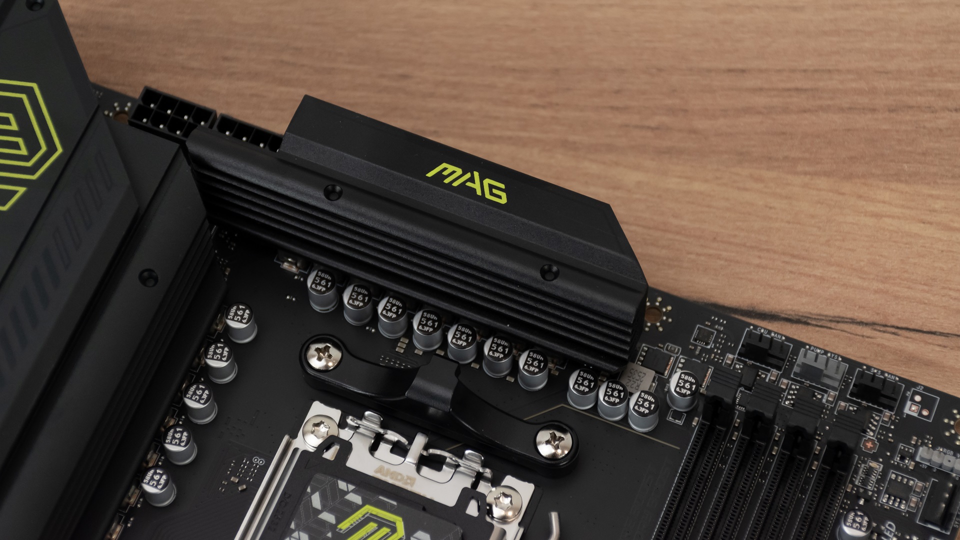 Zaprojektowana przez MSI sekcja zasilania składa się z siedmiu faz z podwojonymi komponentami dla rdzeni oraz dwóch faz dla SOC. Sercem VRM jest kontroler PWM MP2857 produkcji Monolithic Power Systems, a tranzystory to MP87670 od tej samej firmy. Niestety, o tych ostatnich, podobnie jak o kontrolerze, obecnie nie wiemy dużo, bo pełne karty charakterystyki (ang. datasheet) nie są upublicznione, jednakże z dostępnych informacji wynika, iż ich obciążalność w trybie ciągłym wynosi 80 A (najrozsądniej będzie zakładać, że owa wartość dotyczy temperatury obudowy 25 °C). MOSFET-y te w pojedynczej obudowie łączą tranzystory high-side i low-side, a także sterownik. Jest ich łącznie 14 dla rdzeni oraz dwa dla SOC.