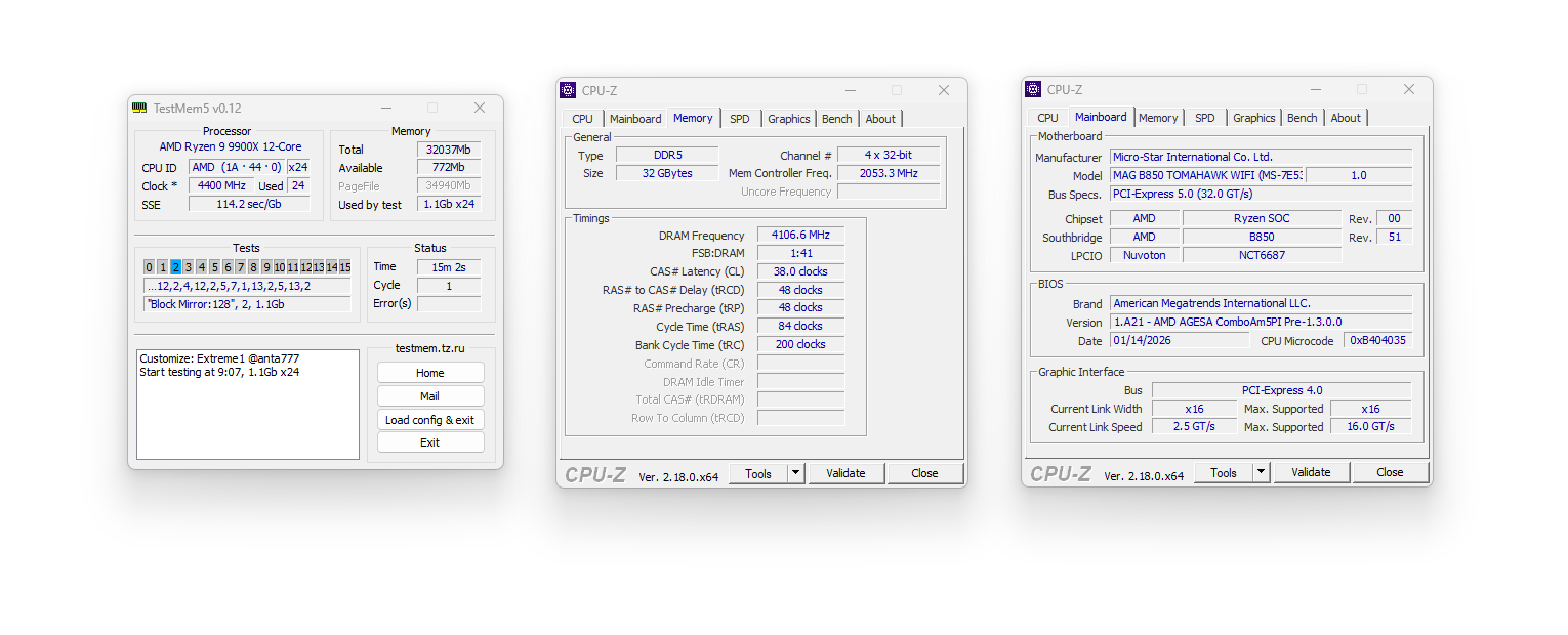 Testy modelu MSI MAG B850 TOMAHAWK WIFI wykonano przy domyślnych zegarach większości komponentów. Jedyna modyfikacja to ustawienie pamięci na DDR5-6000 CL 30, za to z dezaktywacji usług takich jak Turbo oraz Cool'n'Quiet zrezygnowałem, wychodząc z założenia, że jeśli w danym modelu któraś z nich działa niepoprawnie, należy ten fakt ujawnić.