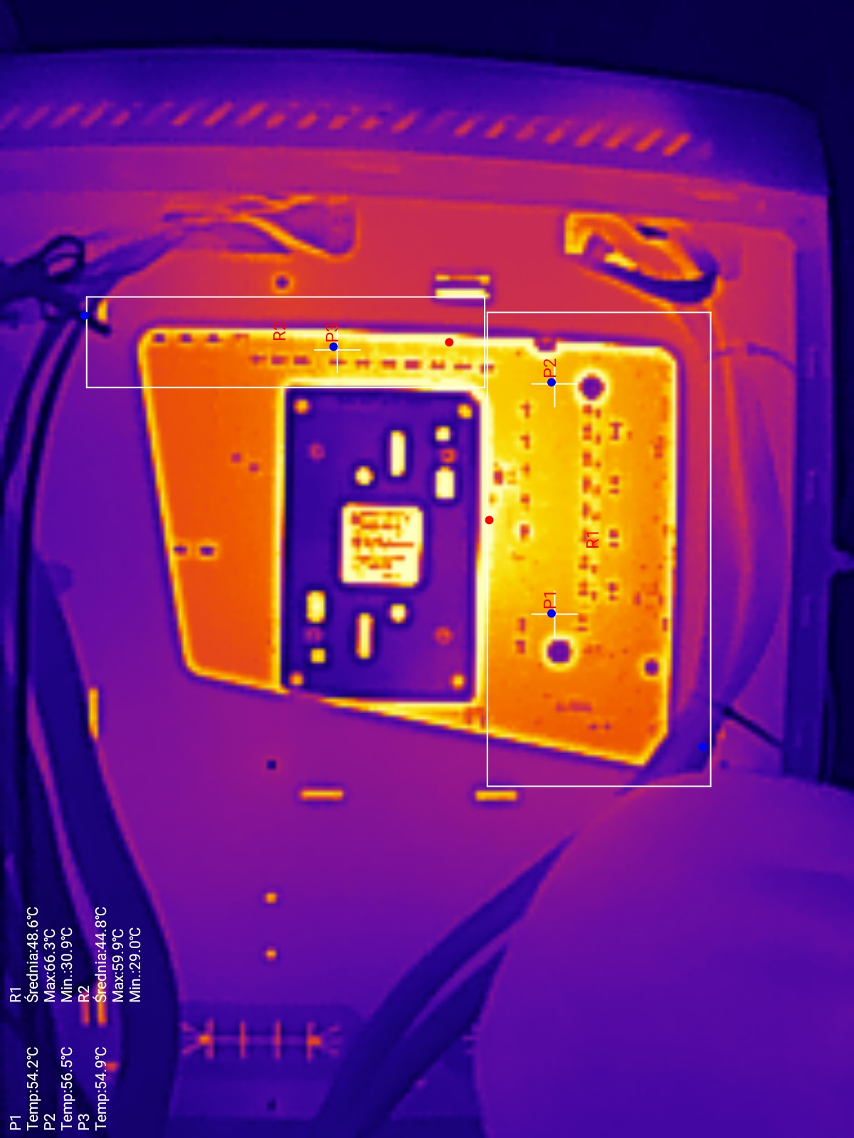 Na potrzeby testów temperatur pomocniczo wykorzystuję pirometr Voltcraft IR 800-20D, o zakresie pomiarowym od -50 do 800 °C. W każdym wypadku wykonywane są maksymalnie dwa pomiary, tzn. jeden dla wbudowanego czujnika (o ile takowy istnieje), zaś drugi na rewersie laminatu – w okolicy MOSFET-ów, z użyciem wspomnianego urządzenia. W tym drugim przypadku za każdym razem staram się odnaleźć możliwie gorący punkt - to on ląduje na wykresach. Testy przeprowadzane są przy procesorze przetaktowanym do 5400 MHz (albo mniej, jeżeli któraś z płyt będzie niedomagać), czemu towarzyszy napięcie rdzeni równe 1,3 V. Obciążenie generowane jest przez 30-minutowy rendering sceny Barbershop w aplikacji Blender. Poza tym pod wykresami odnajdziecie zdjęcie rewersu PCB w podczerwieni, wykonane z wykorzystaniem kamery termowizyjnej InfiRay P2 Pro.
