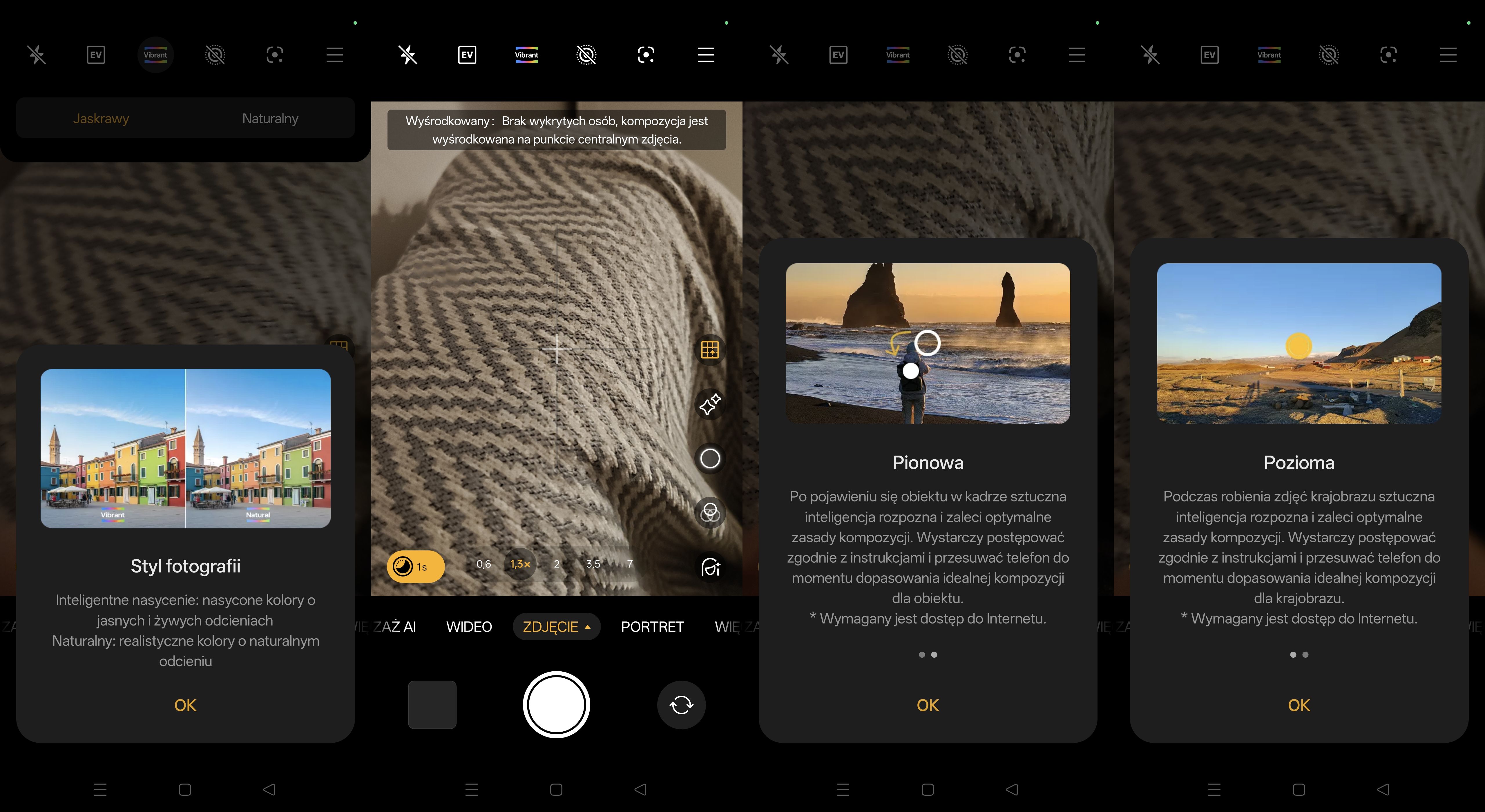 Szczególnie zachwyceni powinni być zaś fani portretów, bo realme wprost mówi o "teleobiektywie do portretów", a do tego przyłożyło się do zadania również od strony oprogramowania, więc w aplikacji aparatu czekają liczne "zabawki". Możemy przebierać pomiędzy różnymi wartościami zoom, predefiniowanymi ustawieniami, stylami, trybami oświetlenia, efektami świetlnymi, opcjami upiększania i tak dalej. Do tego realme ponownie sięgnęło po wsparcie ze strony sztucznej inteligencji, więc możemy liczyć na pomoc choćby Mistrza kadrowania, który pomaga w uzyskaniu jak najlepszej kompozycji, zarówno podczas fotografowania krajobrazu, jak i osób (sztuczna inteligencja rozpoznaje kompozycję i zaleca optymalne ustawienie).