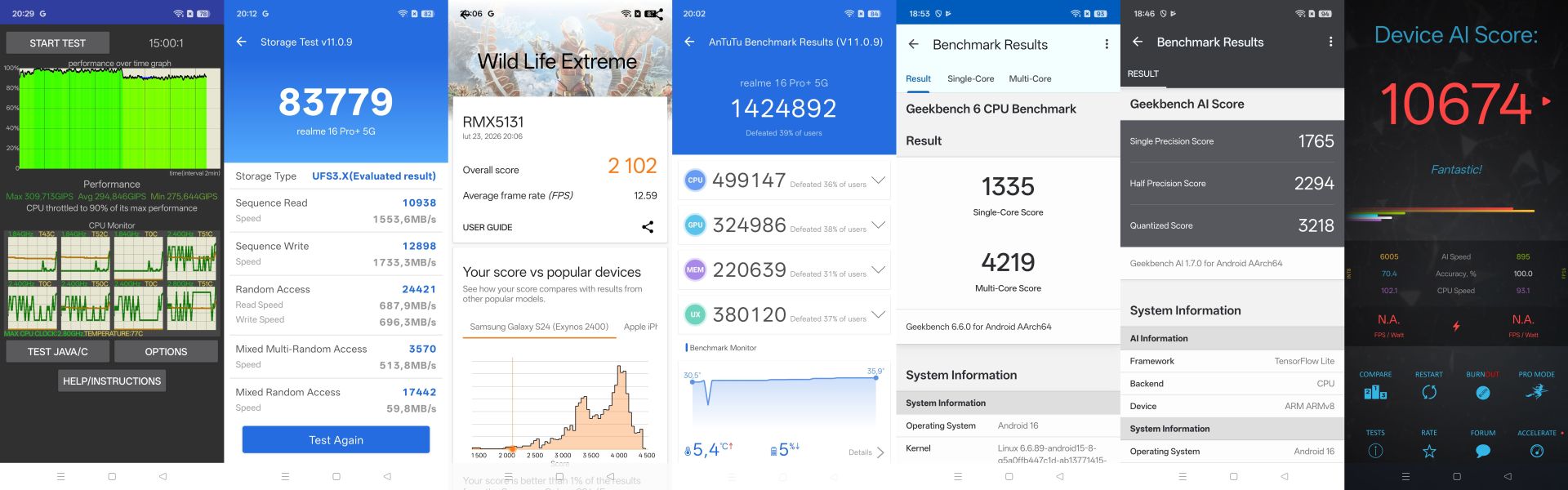 Pod maskę realme 16 Pro+ trafił układ Qualcomm Snapdragon 7 Gen 4 (1x Cortex-720 2.8 GHz, 4x Cortex-720 2.4 GHz, 3x Cortex-520 1.8 GHz) z Adreno 722 wspomagany przez 12 GB pamięci RAM LPDDR5X i 512 GB pamięci na dane UFS 3.1. Jeśli zaś chodzi o opcje łączności, to mamy USB typu C (niestety USB 2.0), NFC, 5G (dual SIM - nanoSIM i eSIM), Wi-Fi 6 (802.11 a/b/g/n/ac/ax), Bluetooth 5.4, NFC oraz nawigację Beidou, GPS, GLONASS, Galileo, QZSS. Identyczny zestaw widzieliśmy niedawno w przypadku motoroli edge 70, co daje niezły obraz tego, do jakich urządzeń skierowane jest to rozwiązanie. Chociaż trzeba uczciwie przyznać, że realme wycisnęło z niego nieco więcej, co nie tylko widać po wynikach w benchmarkach, ale i czuć w codziennym użytkowaniu.