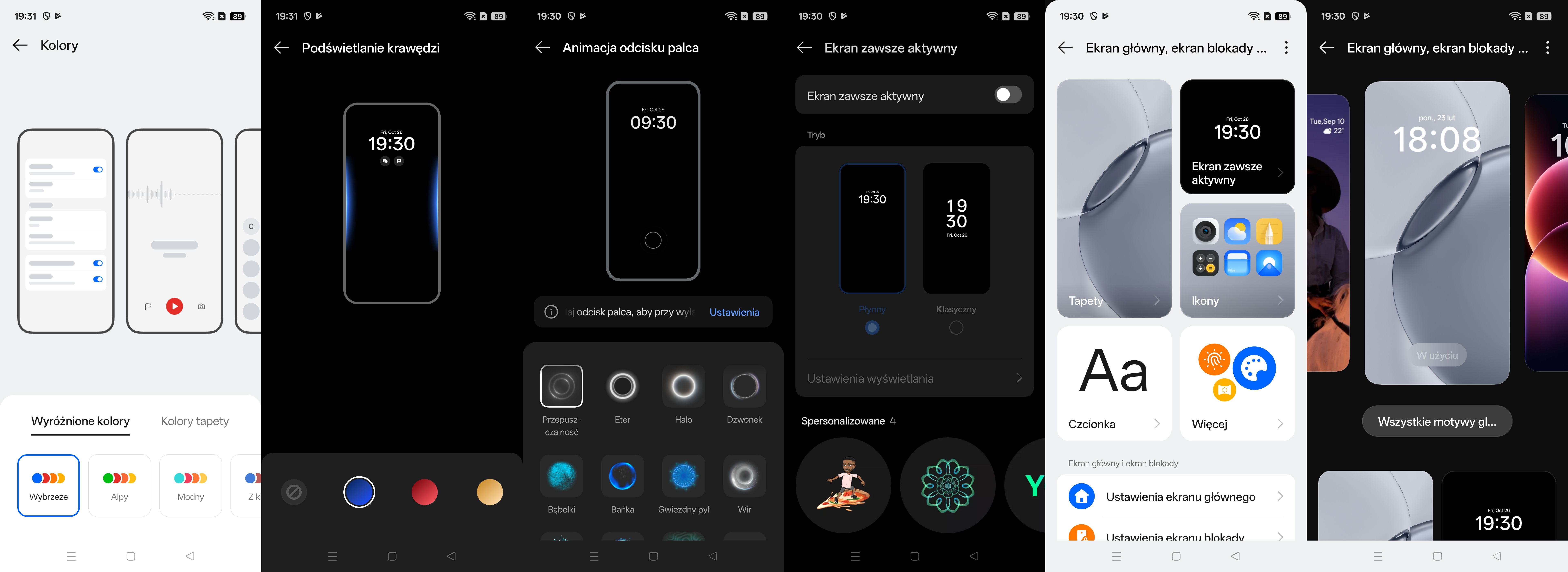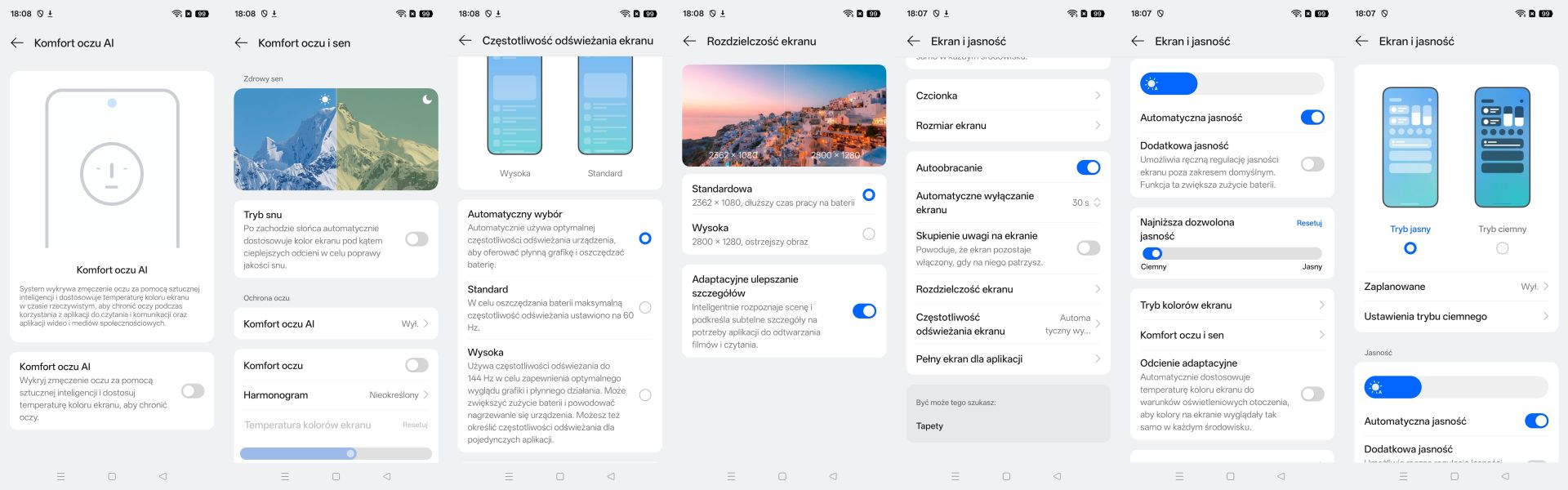 W ustawieniach ekranu możemy wybierać między trybem jasnym i ciemnym (manualnie lub według harmonogramu), ustawić jasność, włączyć dodatkową jasność oraz wskazać najniższą dozwoloną jasność dla aktualnego poziomu podświetlenia, dzięki czemu możemy lepiej dopasować ten parametr do swoich preferencji. Do dyspozycji jest też tryb Komfortu oczu, ręcznie lub według harmonogramu i z opcją dopasowania temperatury kolorów, a także włączenia wspomagania ze strony sztucznej inteligencji. To znana już z wcześniejszych modeli realme opcja, w której system sam wykrywa zmęczenie oczu za pomocą sztucznej inteligencji i dostosowuje temperaturę koloru ekranu w czasie rzeczywistym, aby chronić oczy podczas korzystania z aplikacji do czytania i komunikacji oraz aplikacji wideo i mediów społecznościowych. Możemy tu również dopasować częstotliwość odświeżania ekranu, tj. wybrać między Automatyczną, Standard 60 Hz i Wysoką 144 Hz, choć warto mieć na uwadze, że w rzeczywistości będzie to raczej 120 Hz, bo maksymalne wartości można zobaczyć jedynie w grach i to dosłownie pojedynczych tytułach.