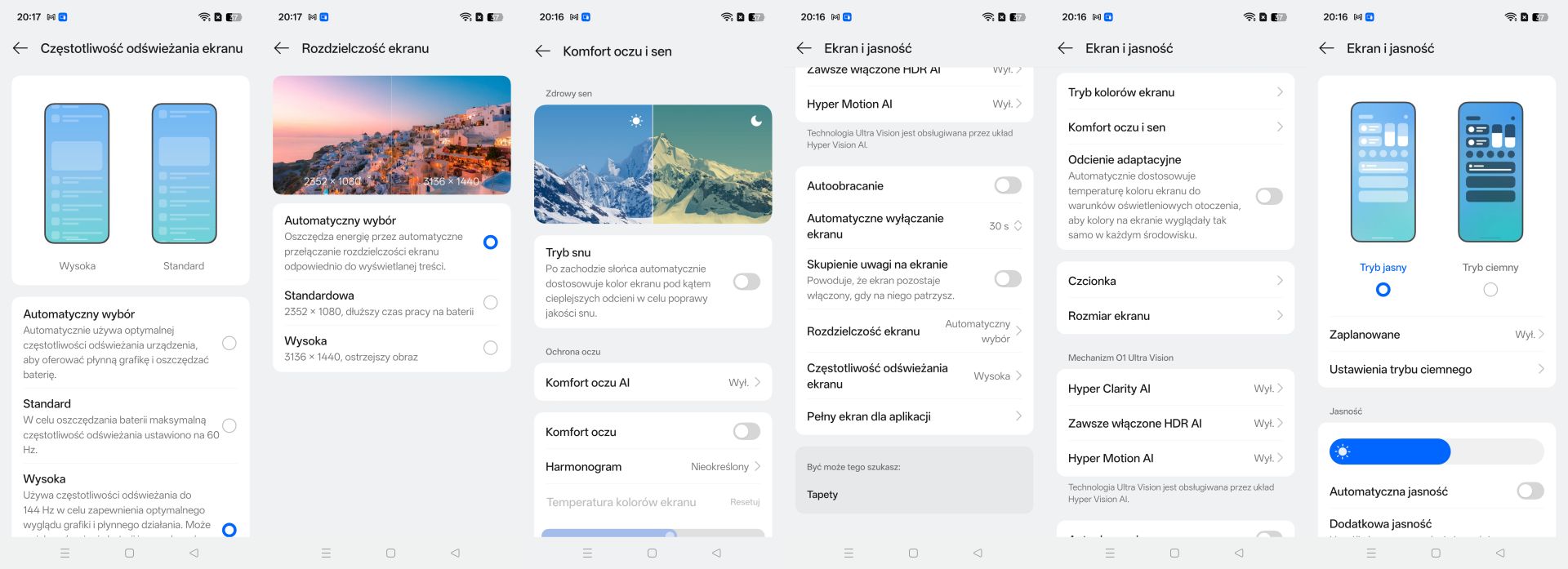 A co znajdziemy w ustawieniach ekranu? Możemy wybierać między trybem jasnym i ciemnym (manualnie lub według harmonogramu), ustawić Jasność, włączyć Automatyczną jasność, skorzystać z Dodatkowej jasności i ustawić najniższą dozwoloną jasność, wybrać tryb kolorów (Naturalne, Pro, Jaskrawe i Tryb zaawansowany z DCI-P3 oraz sRGB do wyboru), zmienić temperaturę kolorów, skorzystać z Komfortu oczu i snu (ręcznie lub według harmonogramu, z opcją dopasowania temperatury kolorów i tekstury) czy Komfortu oczu AI), włączyć odcienie adaptacyjne, wybrać rozdzielczość ekranu (Automatyczna, Standardowa 2352x1080 pikseli lub Wysoka 3136x1440 pikseli) czy dopasować częstotliwość odświeżania ekranu, tj. automatyczny (zmienia się między 60, 90, 120 i 144 Hz), Wysoka 144 Hz i Standard 60 Hz.