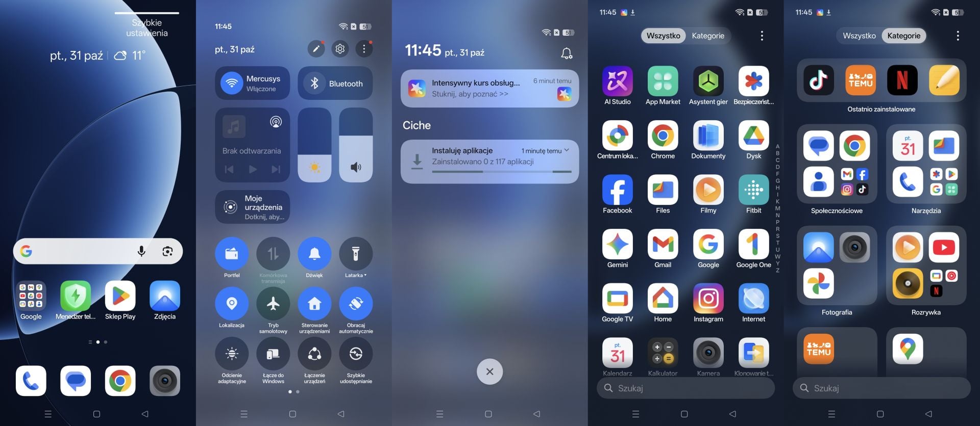 Tak, tu również mamy ikony przepuszczające światło, efekty głębi w tapetach, płynne animacje i tym podobne - ba, producent skusił się nawet na "Bibliotekę aplikacji" w iPhone'owym stylu. Oryginalności może i brak, ale całość wygląda ładnie, przejrzyście i jest bardzo przyjemna w obsłudze. Jak zawsze w przypadku realme możemy też liczyć na bogate opcje personalizacji, z animacją czytnika linii papilarnych włącznie oraz nieco bloatware'u w postaci apek Temu, TikToka czy Netflixa, ale wydaje się, że jest tego mniej niż zwykle.