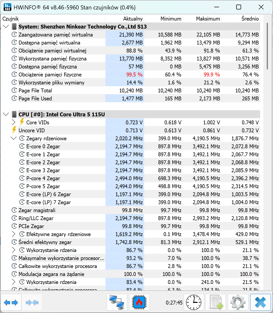 Jak zatem zastosowany układ chłodzenia spisuje się w praktyce? Podczas testów obciążeniowych w Cinebench 2026 rdzenie P w Core Ultra 5 115U osiągały taktowanie do 4,2 GHz, natomiast rdzenie energooszczędne pracowały z częstotliwością około 3,5 GHz. Nie trwało to jednak długo, bo po chwili zegary rdzeni rdzeni wydajnościowych spadły do poziomu 2,3-2,5 GHz, rdzenie E ustabilizowały się w okolicach 2,0 GHz, a LPE zatrzymały się w okolicach 1,1-1,2 GHz