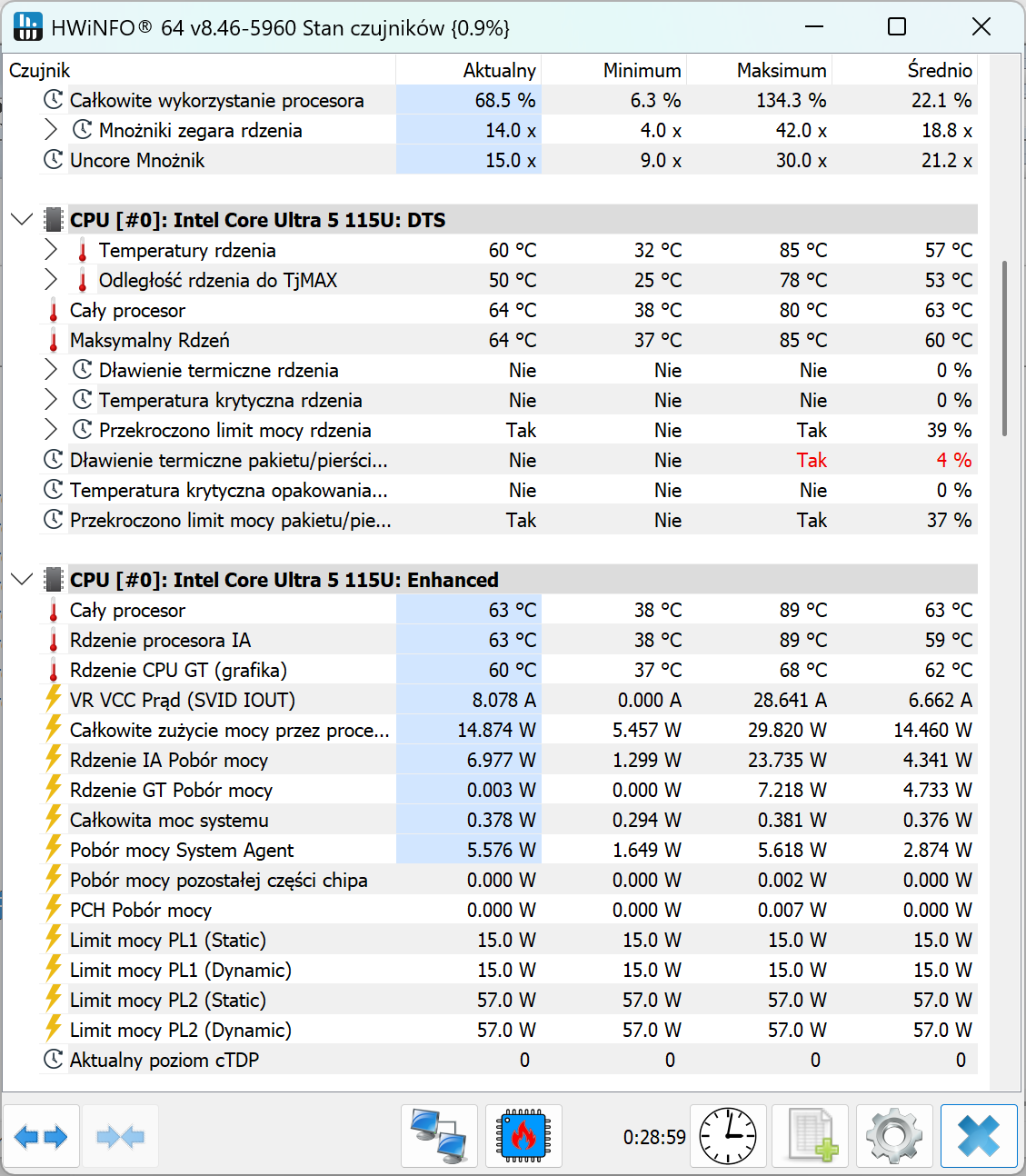 Temperatura na starcie była stosunkowo wysoka i sięgała nawet 86°C dla rdzeni wydajnościowych. Wraz ze spadkiem częstotliwości i ograniczeniem generowanego ciepła, wartości te obniżyły się jednak do około 60°C. Warto dodać, że zastosowany układ ma bazowe TDP na poziomie 15 W, natomiast chwilowo może pobierać do około 38 W. Warto odnotować, że po odłączeniu od zasilania wyniki były praktycznie identyczne.