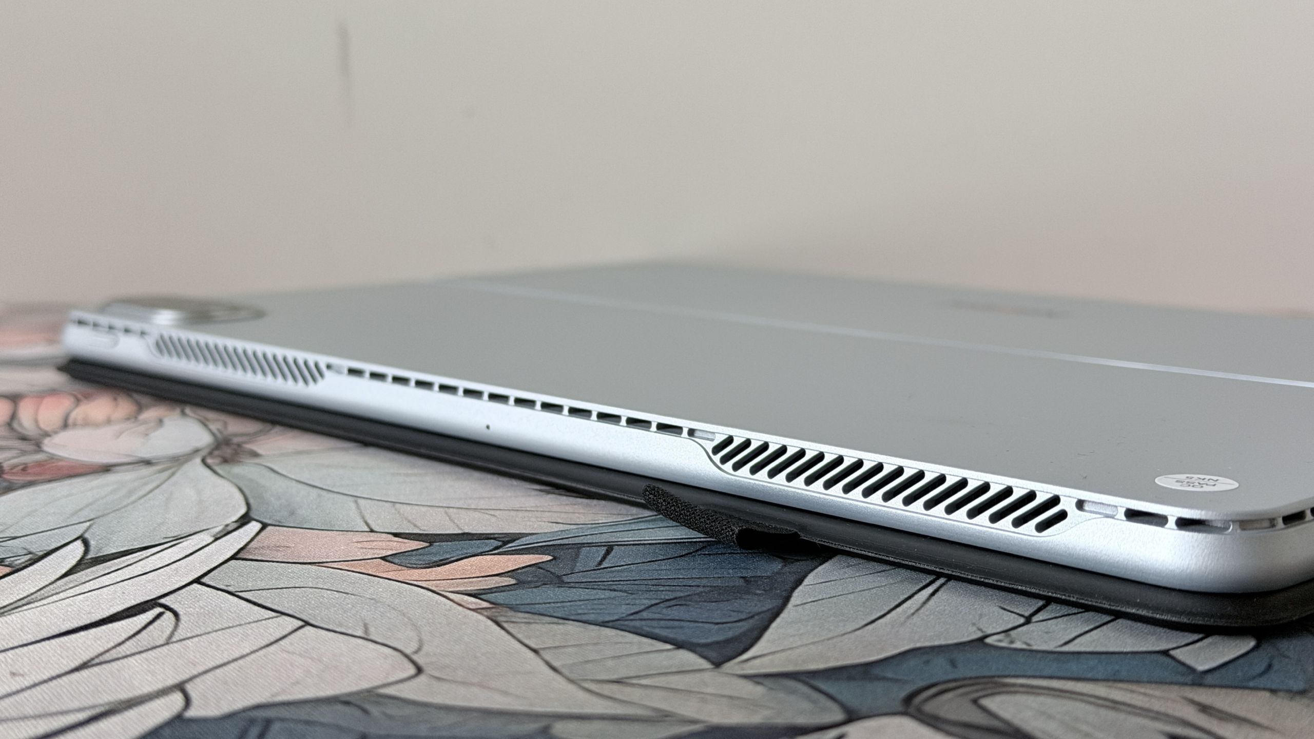 Patrząc na tablet w pozycji horyzontalnej, na górnej krawędzi, z lewej strony, umieszczono przycisk power oraz liczne otwory wentylacyjne. Z kolei po lewej znajduje się belka do regulacji głośności, a po obu bokach widać więcej otworów na wlot chłodnego powietrza.