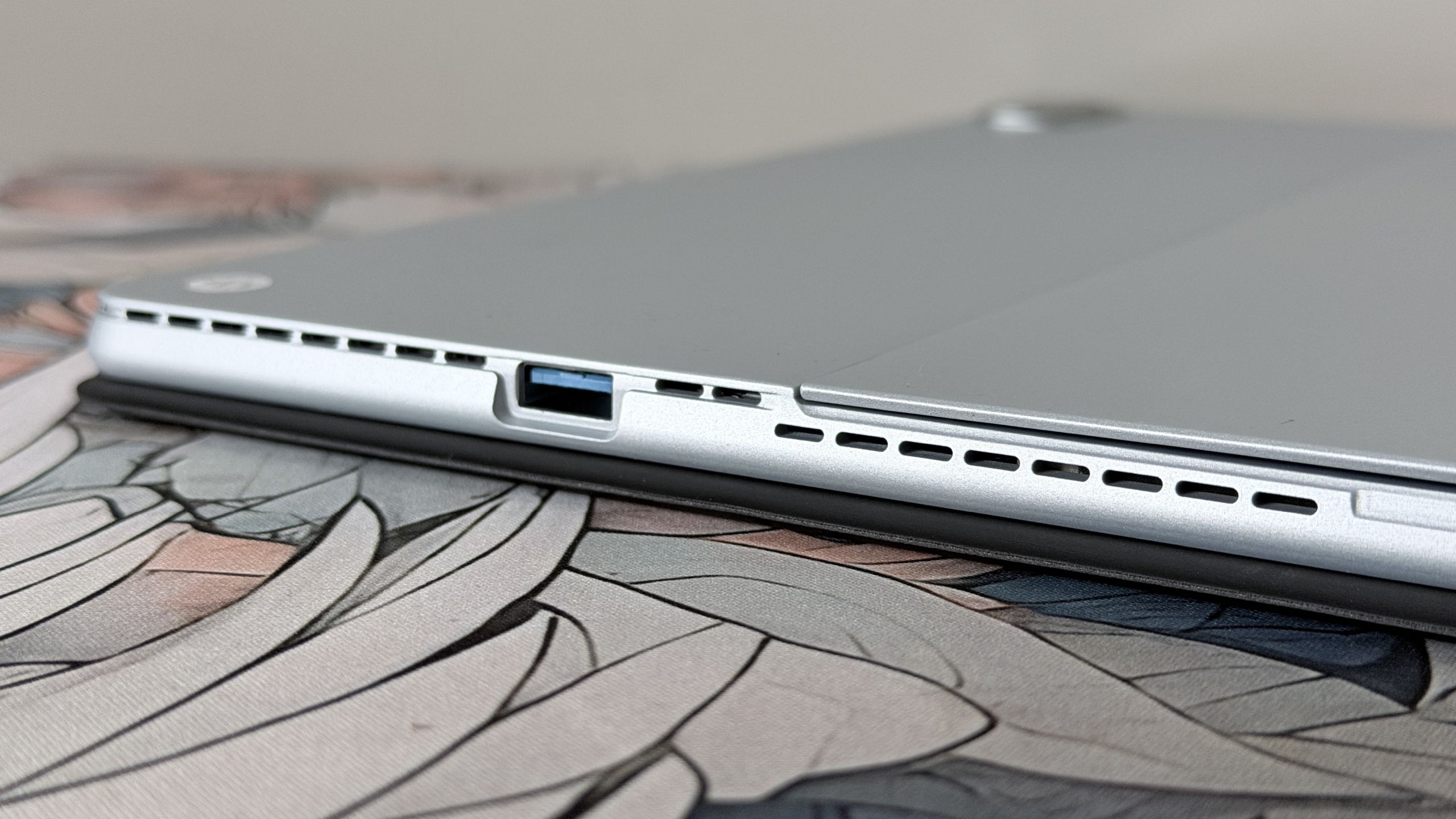Zdajemy sobie sprawę, że w gruncie rzeczy mamy do czynienia z tabletem, a nie pełnoprawnym laptopem, co rodzi liczne kompromisy konstrukcyjne, ale mimo wszystko producent poszedł nieco za daleko w kwestii dostępnych portów. Otrzymujemy bowiem tylko dwa USB 3.2 Gen2 typu C (do 10 Gb/s, z obsługą DisplayPort 1.2 i ładowania, w tym zwrotnego) oraz pojedyncze USB 3.2 Gen1 typu A (5 Gb/s). Oznacza to, że nie uświadczymy tu nawet złącza audio typu minijack na słuchawki/mikrofon, nie wspominając nawet o dodatkowych wyjściach wideo.