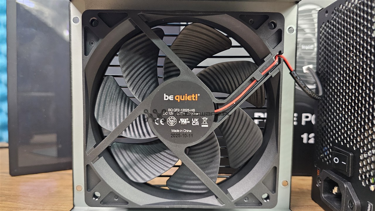 Za chłodzenie elektroniki odpowiada wentylator be quiet! BQ QF2-12025-HS, który pracuje w trybie półpasywnym. Z etykiety na wentylatorze wynika, że jest to jednostka DC 12 V, 0,37 A, a deklarowana prędkość maksymalna wynosi 2700 obr./min. Łopatki mają karbowany profil, co ma wspierać przepływ powietrza i ograniczać niepożądane zawirowania.