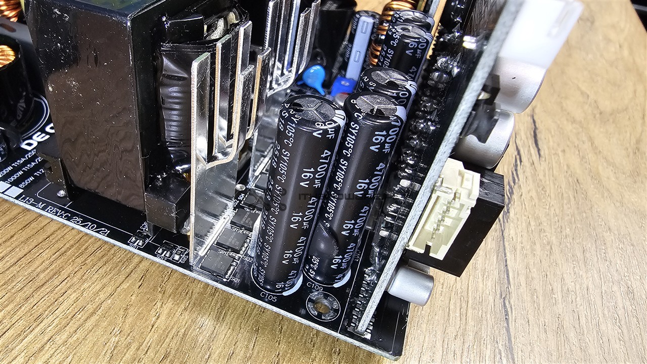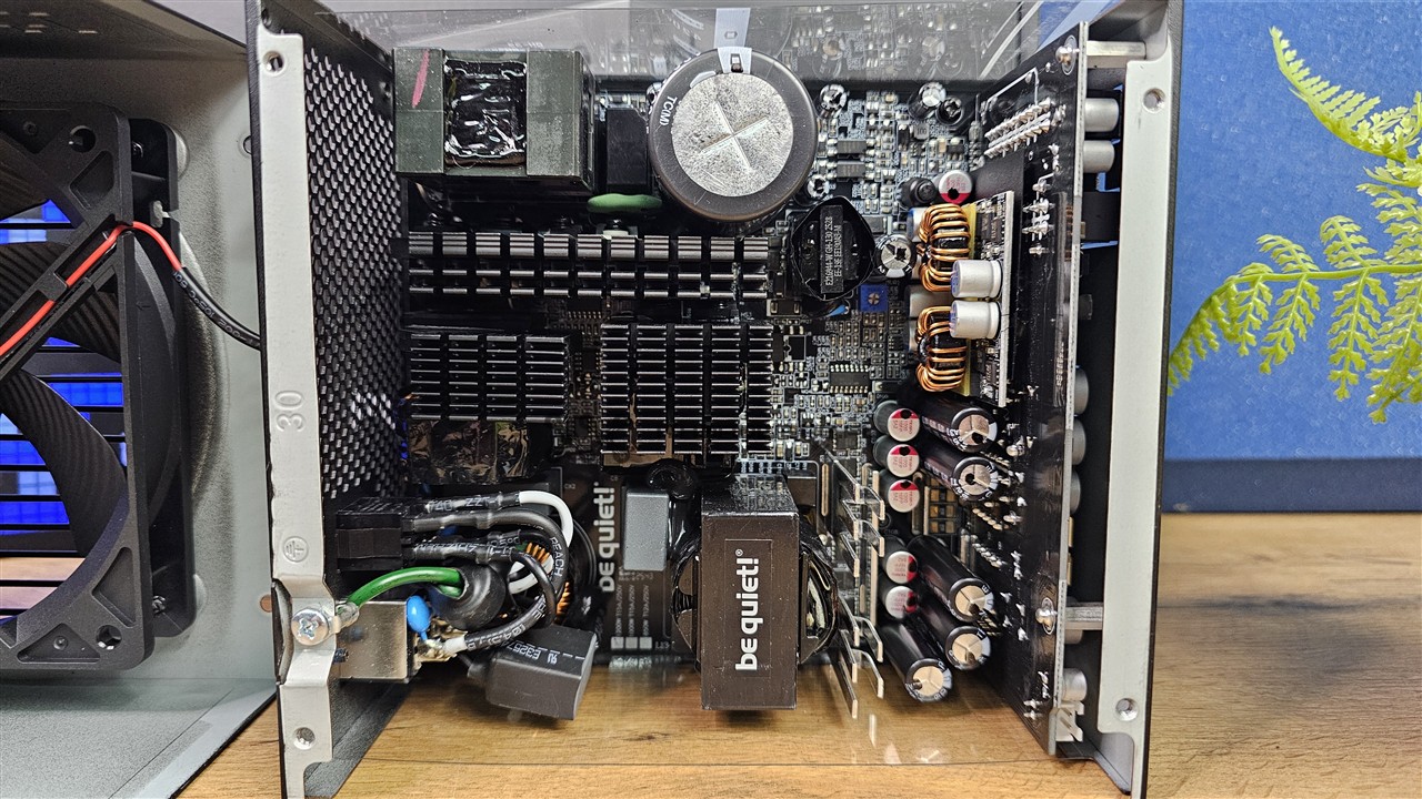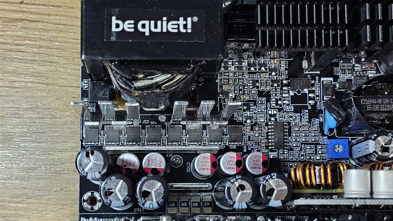 Analizując rozmieszczenie elementów w Pure Power 13 M 1200 W, po lewej stronie umieszczono filtr EMI oraz radiator mostków prostowniczych, a tuż za nim radiator chłodzący sekcję APFC. Dalej znajduje się cewka sekcji APFC, obok umieszczono duży wysokonapięciowy kondensator filtrujący Teapo, przystosowany do pracy w temperaturze do 85 °C. Pod nim znalazły się elementy obwódu 5 Vsb oraz sekcję kluczowania, która oparta jest na topologii pół mostu. Pod sekcją kluczowania mamy elementy układu rezonansowego LLC. Za transformatorem głównym, na laminacie, umieszczono sekcję prostowania linii +12 V opartą na synchronicznym prostowniku. W jej bezpośrednim sąsiedztwie znajdują się dodatkowe kondensatory polimerowe i elektrolityczne. Po prawej stronie znalazł się kolejny pionowy laminat z przetwornicami DC-DC. Tuż przy samej krawędzi obudowy przylutowano PCB z gniazdami modularnego okablowania, gdzie również dodano kondensatory aluminiowo-polimerowe.
