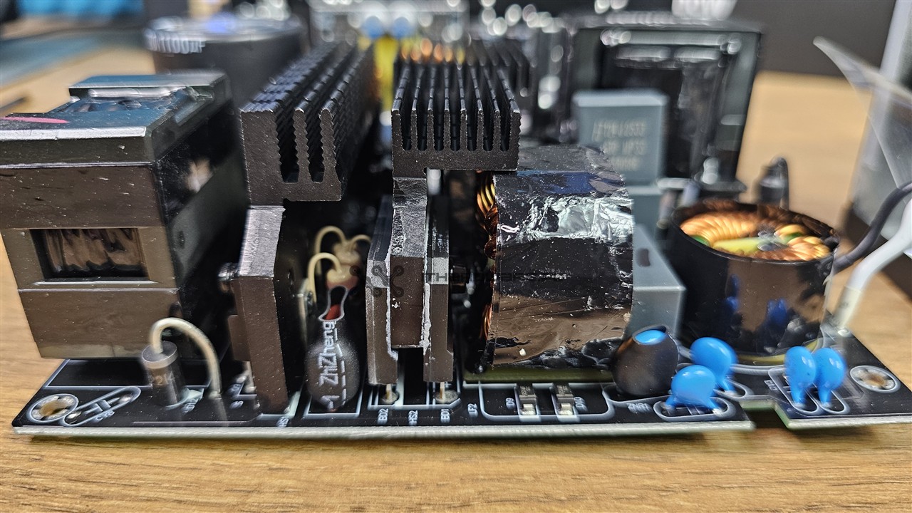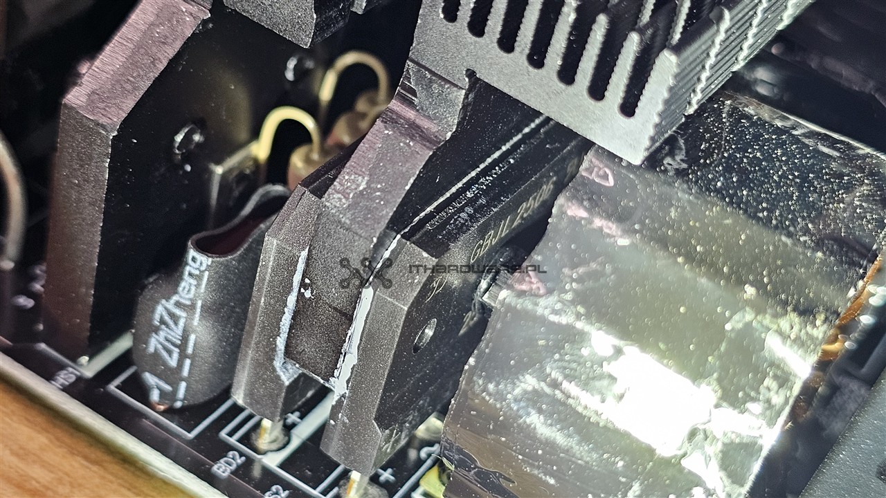 Do chłodzenia kluczowych komponentów zastosowano trzy aluminiowe radiatory o zwiększonej pojemności cieplnej, anodowane na czarno. Dodatkowo mamy dwie metalowe blaszki, które wspomagają odbiór ciepła z sekcji prostowania umieszczonej po stronie wtórnej. W tym przypadku producent zastosował termopad wspomagający odbieranie ciepła przez obudowę.