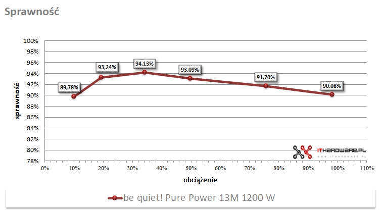 W standardowym zakresie obciążeń, od około 10% do 110% mocy znamionowej, zasilacz be quiet! Pure Power 13M 1200 W osiąga najwyższą sprawność przy obciążeniu zbliżonym do 35%–50% (T3–T4), gdzie wyniosła ona odpowiednio 94,13% oraz 93,09%. W przedziale od około 20% do 75% mocy znamionowej sprawność utrzymywała się na poziomie 93,24%–91,74%. Przy obciążeniu znamionowym (T6) sprawność wyniosła 90,08%, natomiast w teście przeciążeniowym (110%) spadła do 88,97% przy mocy oddanej 1318,6 W.