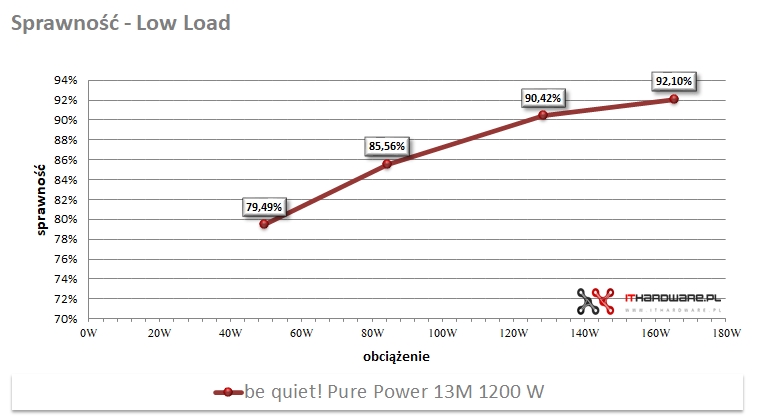 W testach niskiego obciążenia sprawność be quiet! Pure Power 13M 1200 W rozpoczynała się od 79,49% przy około 4,14% obciążenia (LP1), by wzrosnąć do 92,10% przy obciążeniu wynoszącym 13,78% (LP4). Charakterystyka sprawności przy niskich obciążeniach jest typowa dla jednostek o wysokiej mocy znamionowej, a wraz ze wzrostem obciążenia wartości szybko stabilizują się na wysokim poziomie.